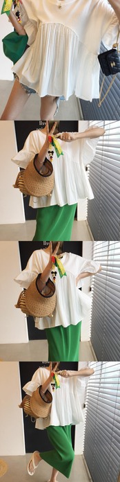 [EWQ] レディース プリーツ パッチワーク バットウィング スリーブ ルーズ Tシャツ O ネック Tシャツ 夏潮トップス 16O372 サマー 夏物 Oネック