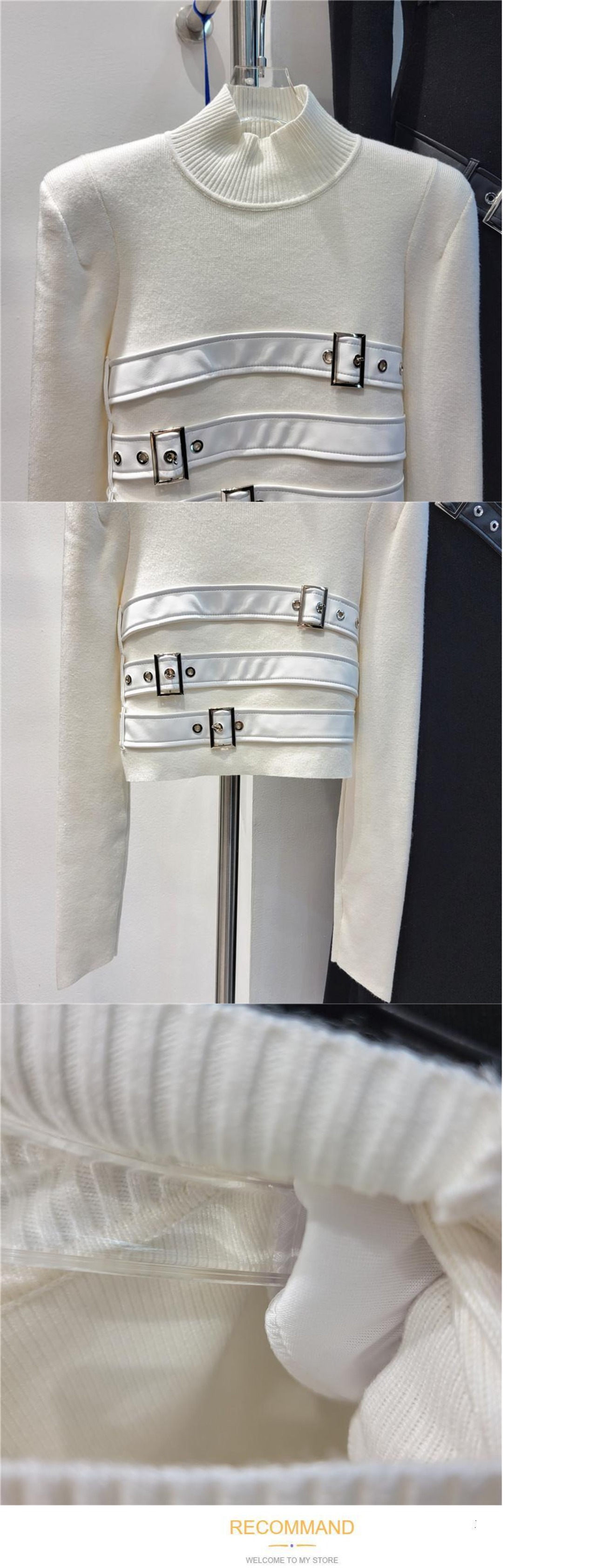[EWQ] バックル包帯装飾セーター白長袖シルム弾性プルオーバーニット秋冬 6U4708 ロング ホワイト エラスティック 伸縮 オータム 秋物 ウィンター 冬物