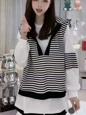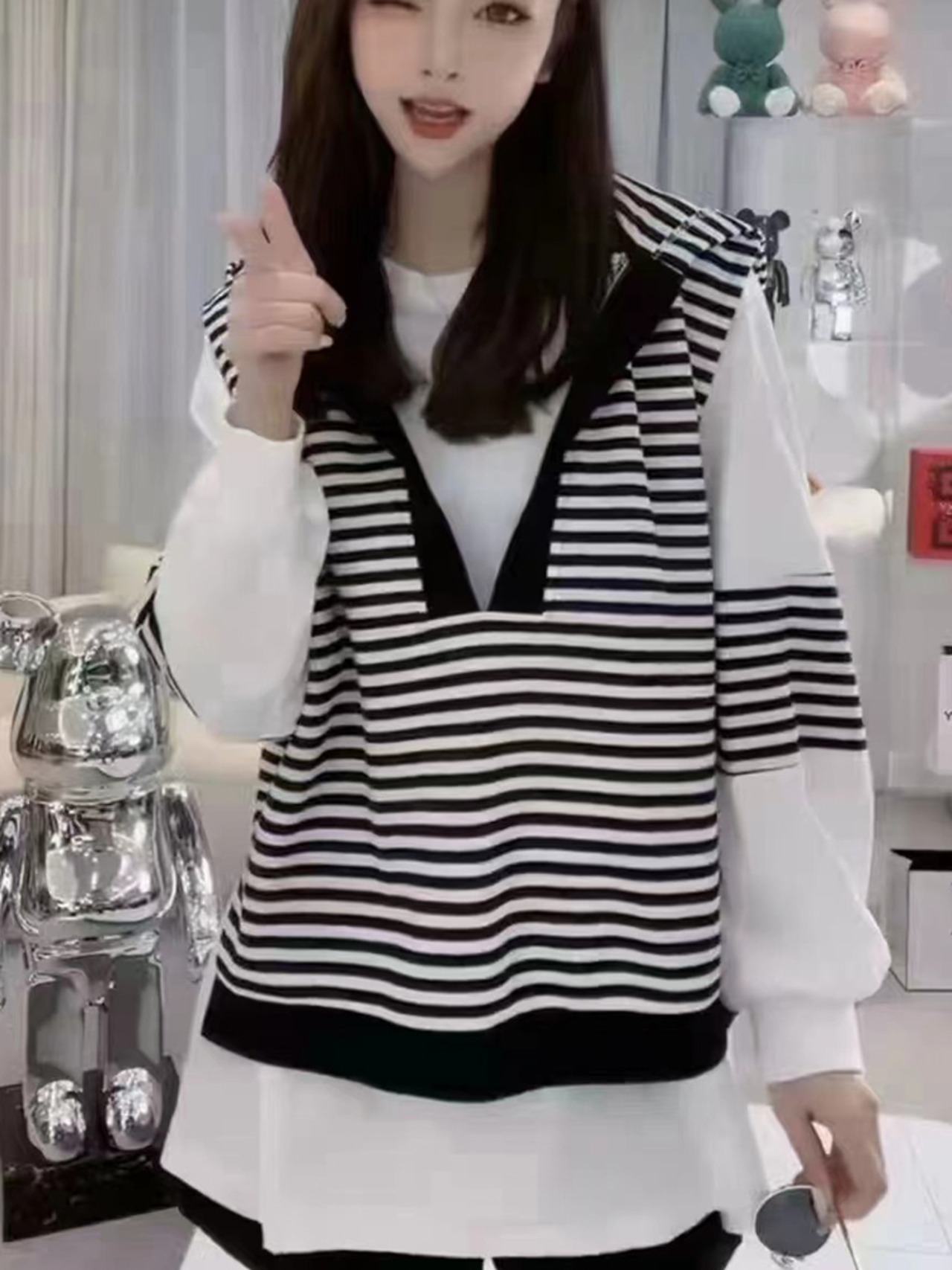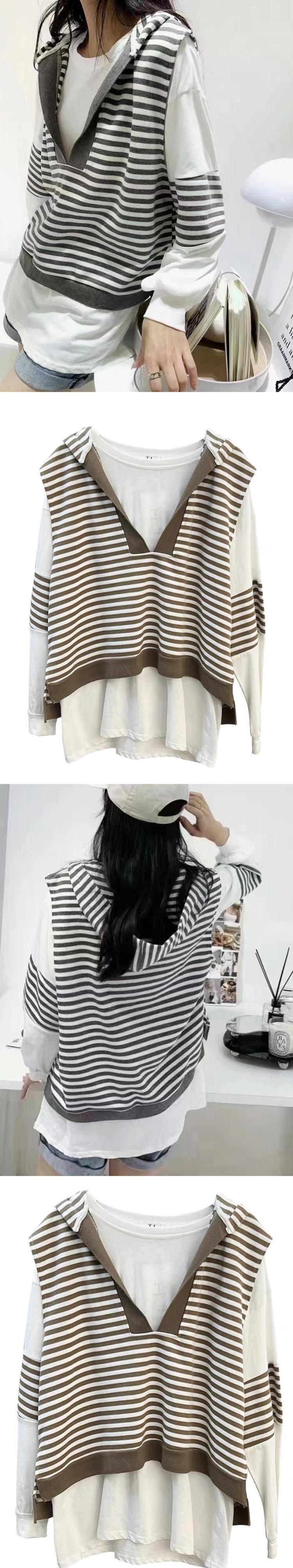 [EWQ] ビッグサイズストライプコントラストフード付きスウェットフェイクツーピースパッチワークルーズプルオーバー秋冬 16U4066 シャツ オータム 秋物 ウィンター 冬物