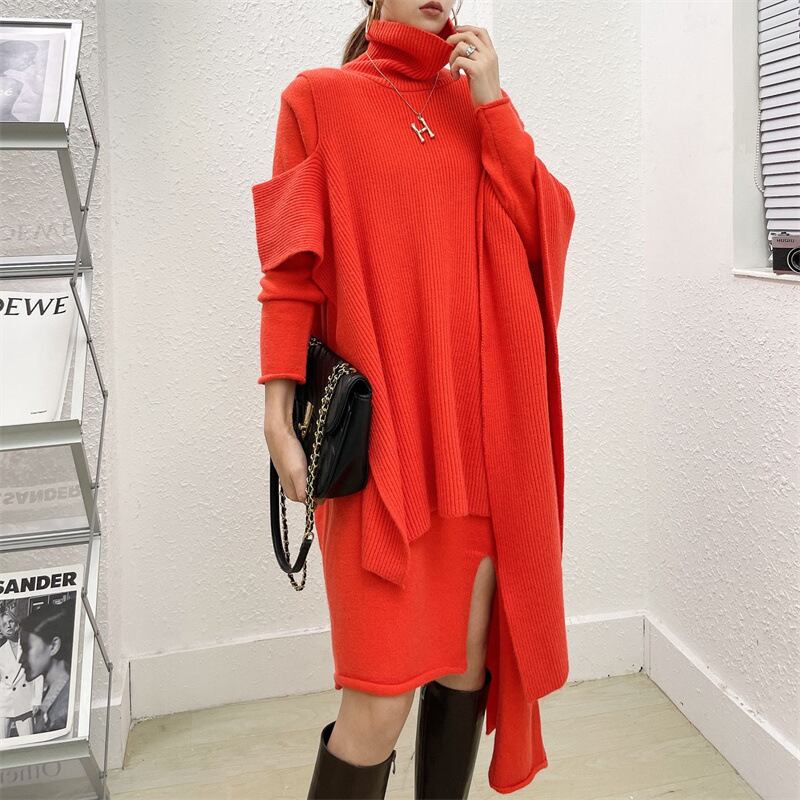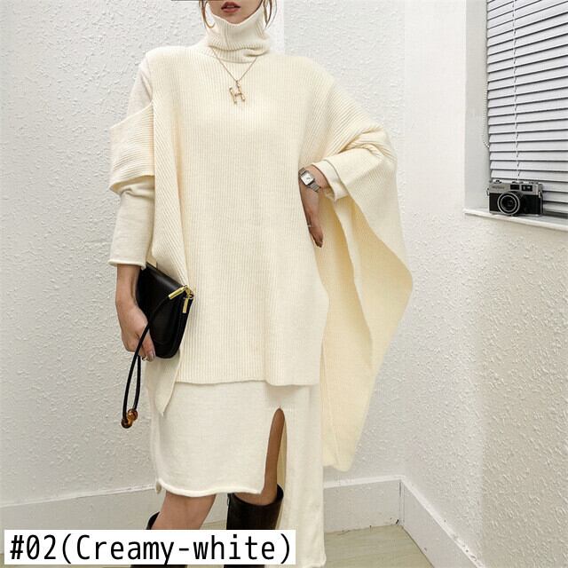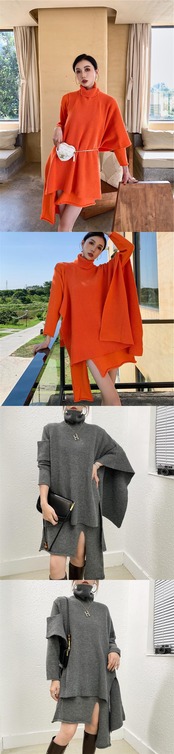 [EWQ] 甘い特大ノースリーブタートルネックプルオーバーショールトップ + 長袖ロングオレンジセーター美しい 2 点セット U43 大人ガーリー スウィート キュート カジュアル