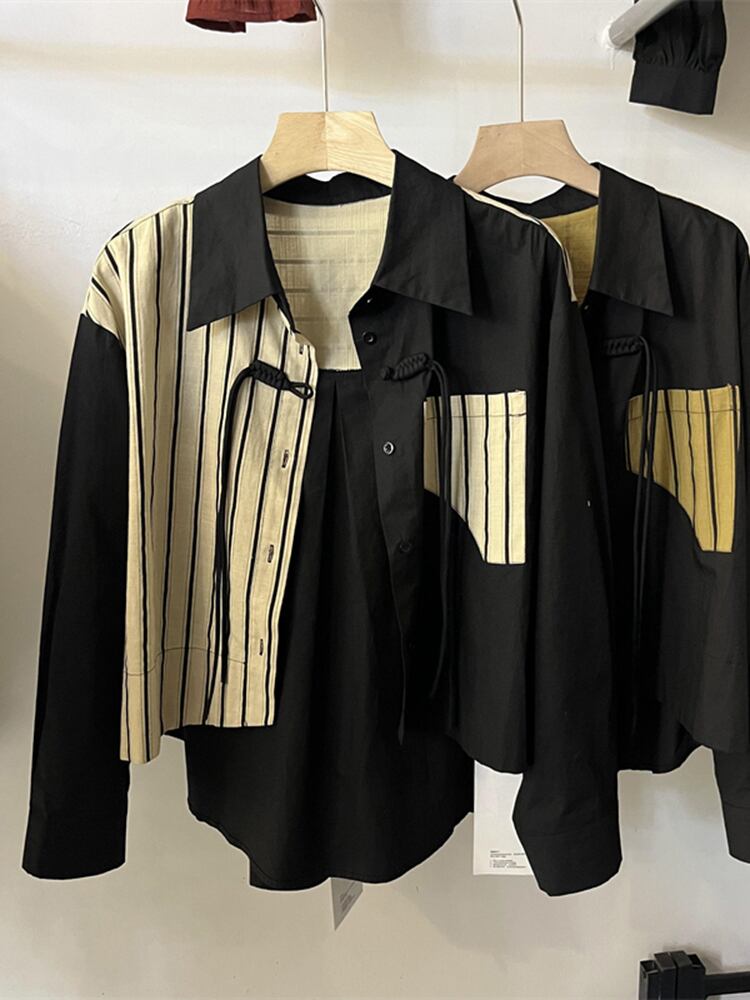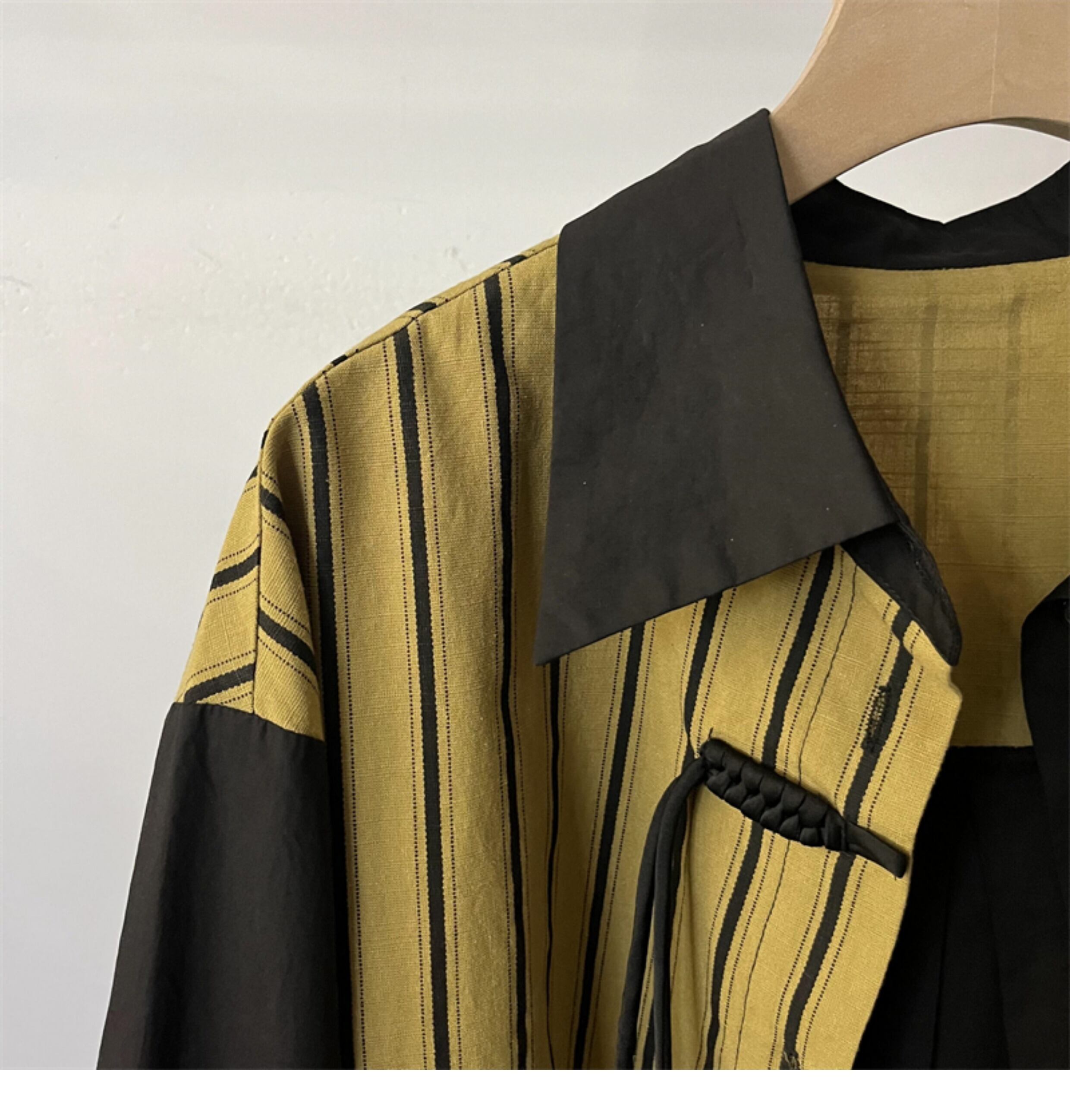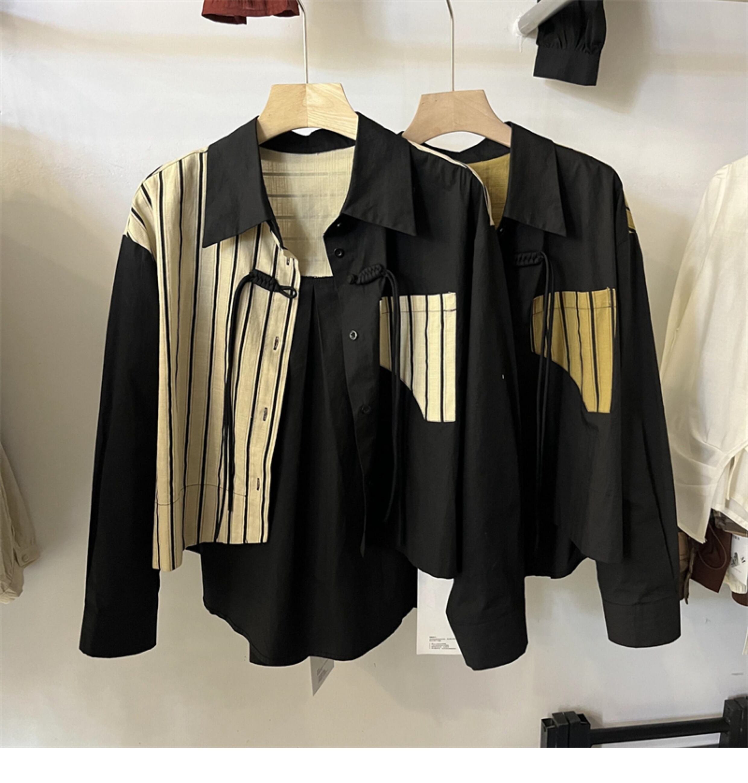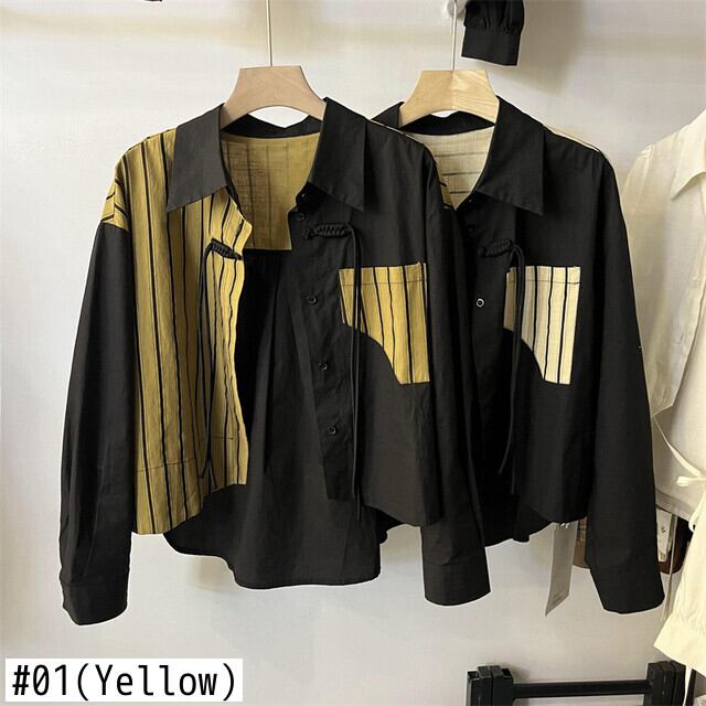 [EWQ] ストライプ パッチワーク コントラスト シャツ レディース 長袖 シック ネクタイ ボタン ルーズ トップ 秋冬 16U4837 ロング オータム 秋物 ウィンター 冬物