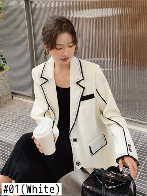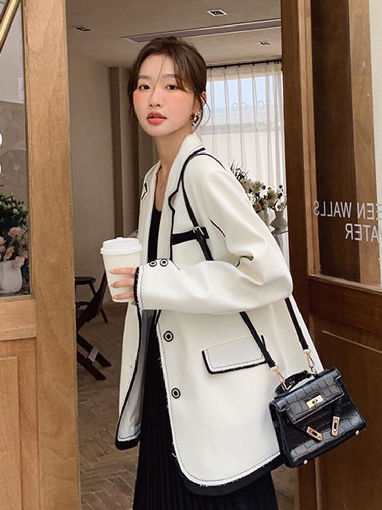 [EWQ] ホワイト ブラック コントラスト ブレザー コート レディース 長袖 ルーズ 2 ボタン スーツ ジャケット 秋冬 16U4663 ロング オータム 秋物 ウィンター 冬物