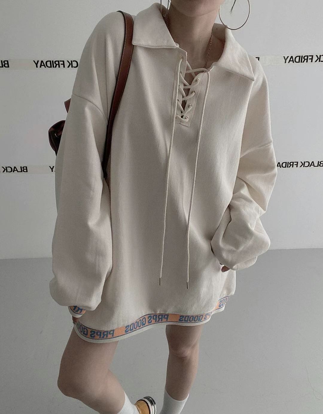 [EWQ] レースアップ織りスウェット長袖裾レターパッチワークルーズプルオーバー秋冬潮トップ 16U4795 ロング シャツ オータム 秋物 ウィンター 冬物