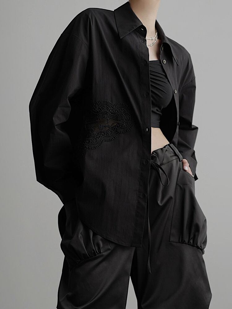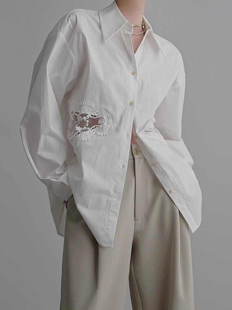 [EWQ] スプライスレース中空シャツ レディース ラペル 長袖 ホワイト シングルブレスト 秋冬 16U4323 ロング オータム 秋物 ウィンター 冬物
