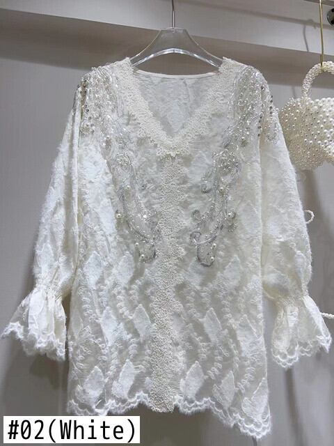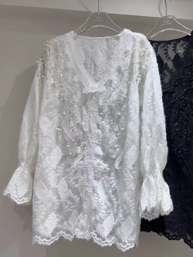 [EWQ] 刺繍フックフラワー V ネックシャツ長袖パール装飾秋冬潮トップ 16U3706 ロング オータム 秋物 ウィンター 冬物 Vネック 真珠 フラワーデザイン