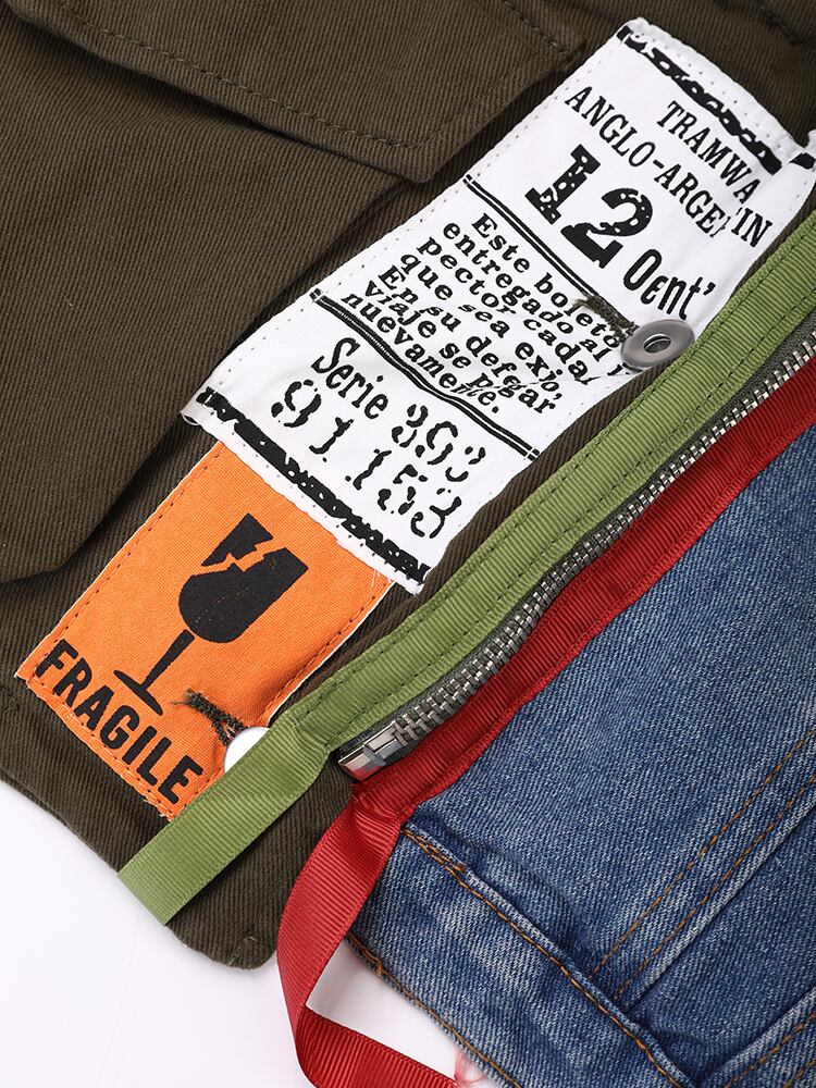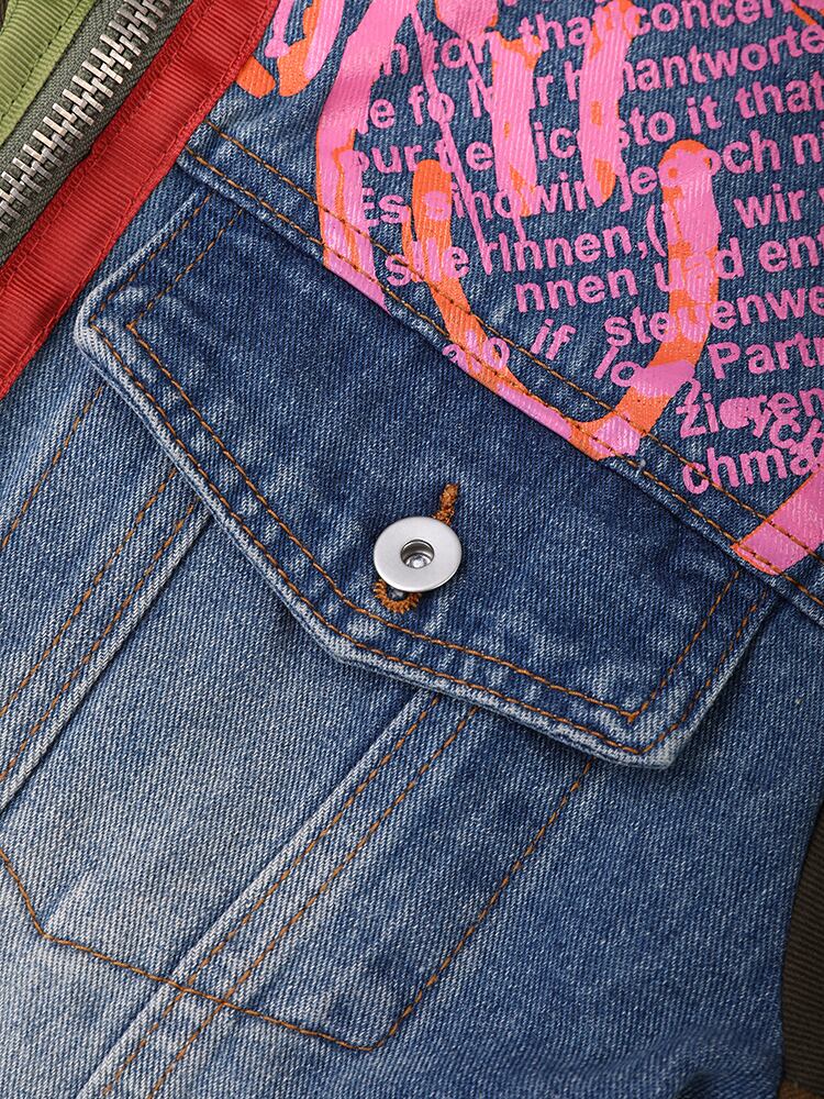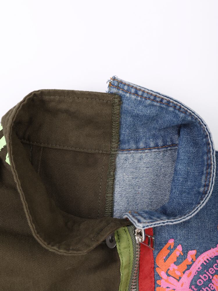 [EWQ] ストリートレタープリントパッチデニムジャケット長袖ジッパーリボンルーズコート秋アウター Y6309 ロング オータム 秋物