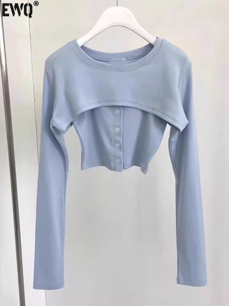 [EWQ] セクシー弾性ストラップタンクトップ + 長袖不規則ショートスウェットブルー秋冬 16U4768 ロング シャツ エラスティック 伸縮 オータム 秋物 ウィンター 冬物
