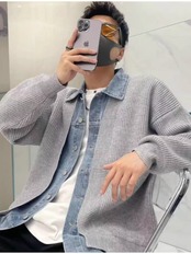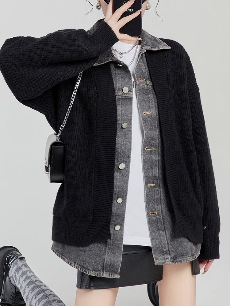 [EWQ] ストリートデニムパッチワークセータージャケットシングルブレストルーズカーディガンコート秋冬トップ 16U4814 オータム 秋物 ウィンター 冬物