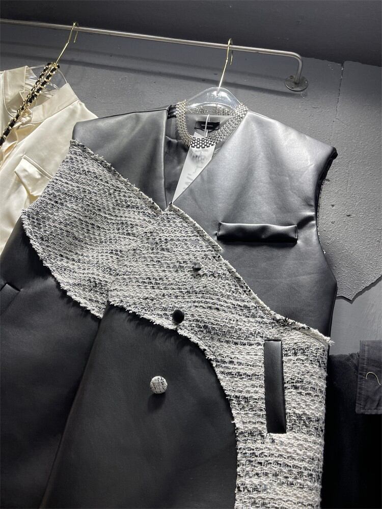 [EWQ] Vネック レザー ベスト ウォメ 小ボタン飾り 変則パッチワーク ノースリーブ ジャケット 秋冬 16U4636 オータム 秋物 ウィンター 冬物
