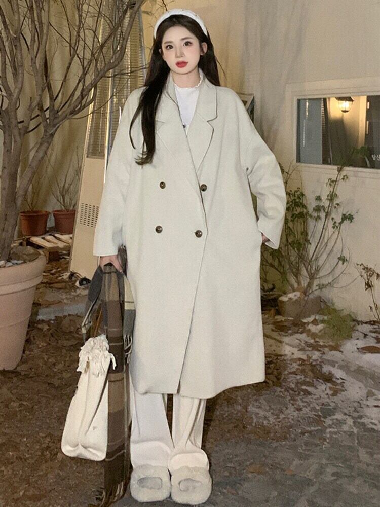 [EWQ] ビッグサイズダブルポケットウールコート長袖ルーズ秋冬厚手潮ジャケット 6U4308 ロング オータム 秋物 ウィンター 冬物