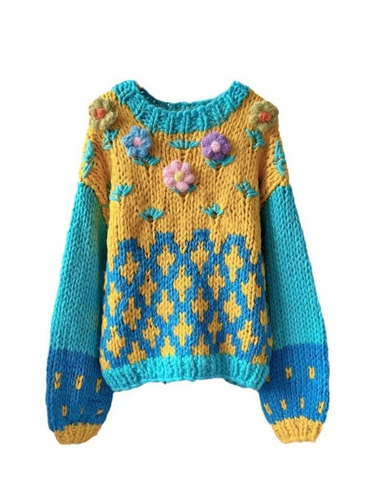 [EWQ] 甘いセーター手作り織花長袖プルオーバーニットトップ秋冬服 16U5118 ロング 大人ガーリー スウィート キュート カジュアル オータム 秋物 ウィンター 冬物 フラワーデザイン
