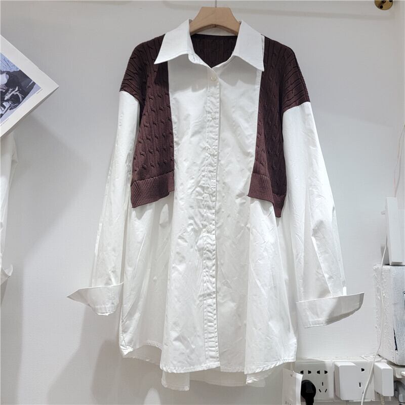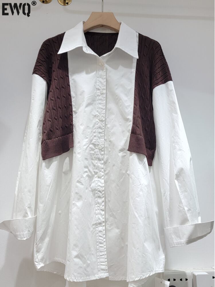 [EWQ] フェイク ツーピース ショール パッチワーク シャツ レディース 裾非対称 大きいサイズ トップス 秋冬 16U4657 オータム 秋物 ウィンター 冬物