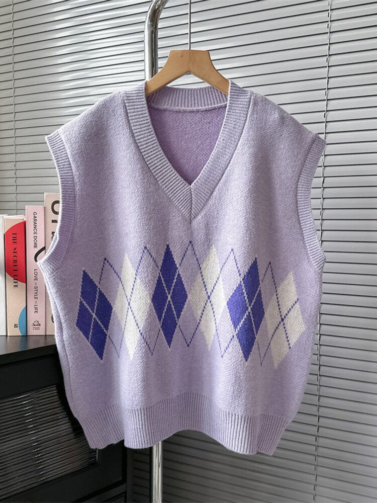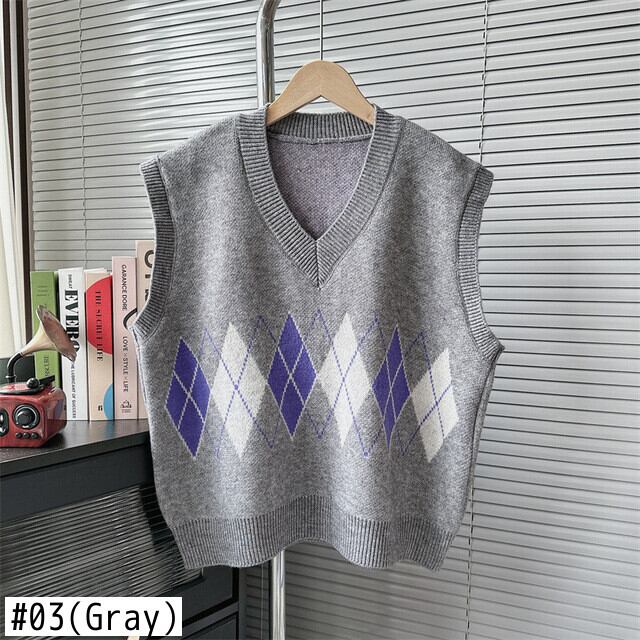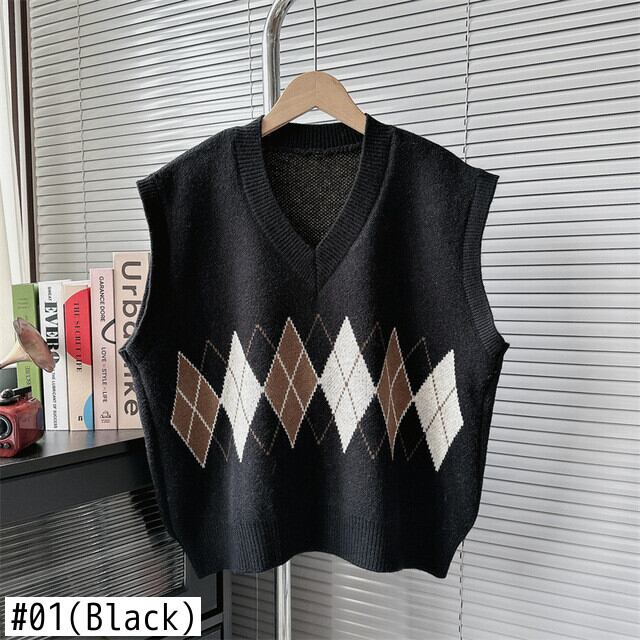 [EWQ] プリントチェック V ネックセーターベスト弾性ノースリーブニットタンクトップ秋冬 16U5098 レッド エラスティック 伸縮 オータム 秋物 ウィンター 冬物 Vネック