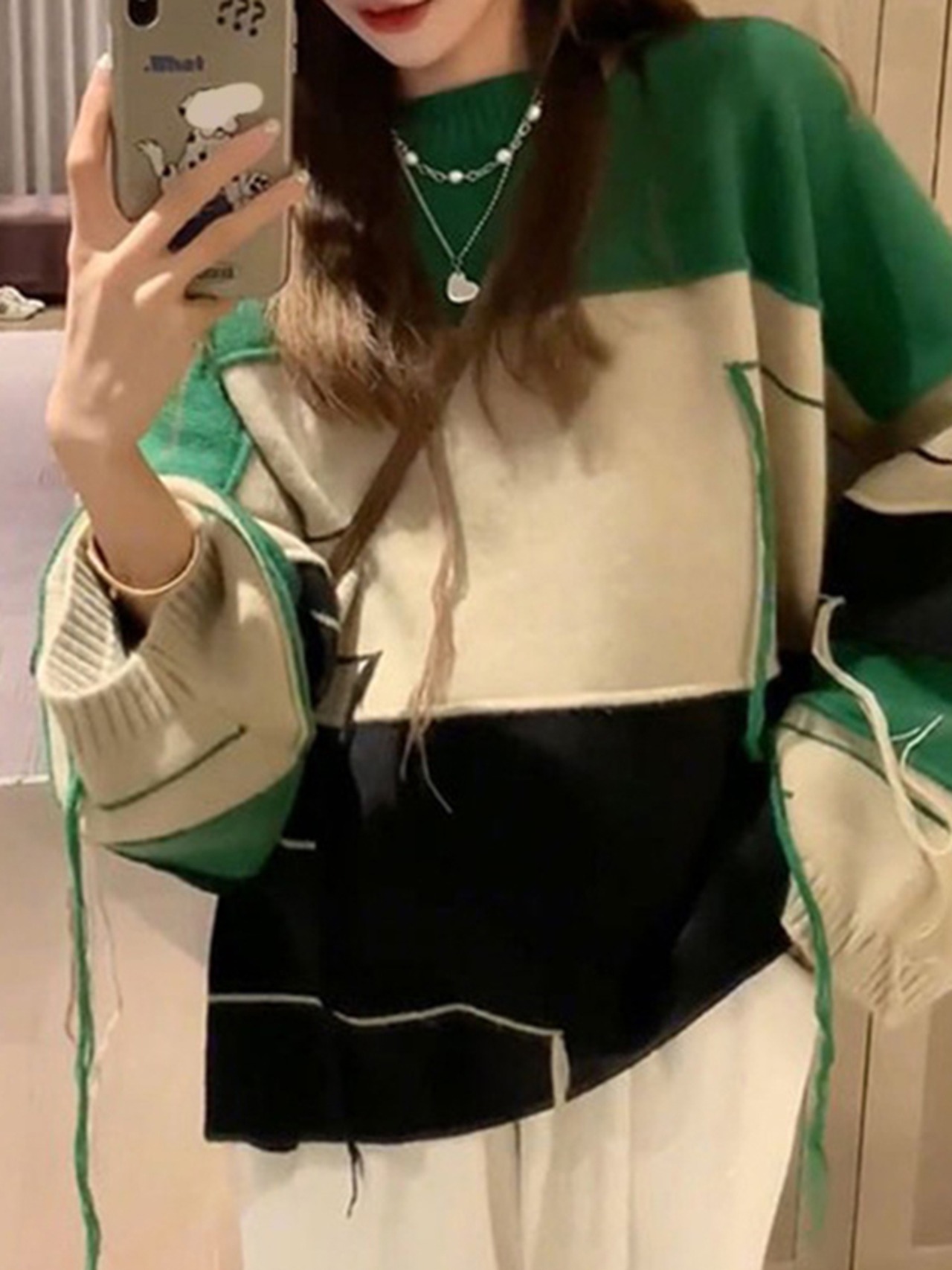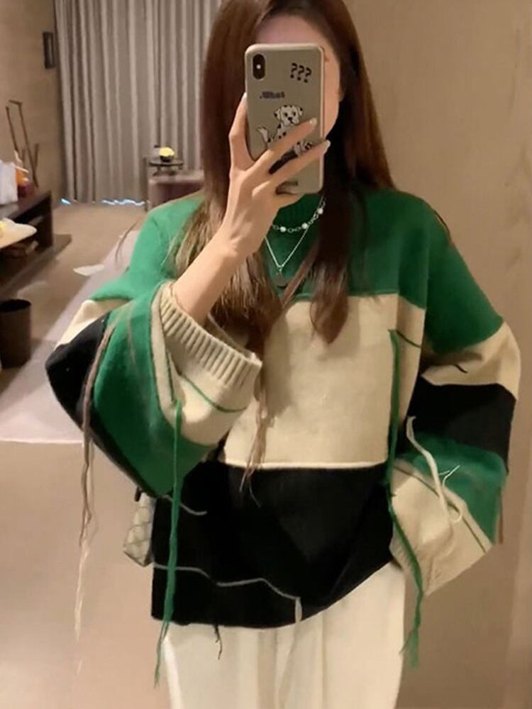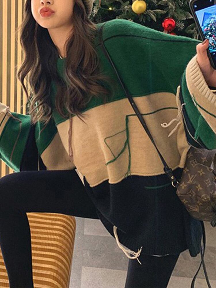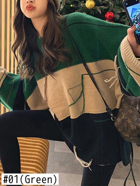 [EWQ] ラインテルコントラストカラーセーター長袖ルーズプルオーバーニット秋冬潮 16U3998 ロング オータム 秋物 ウィンター 冬物