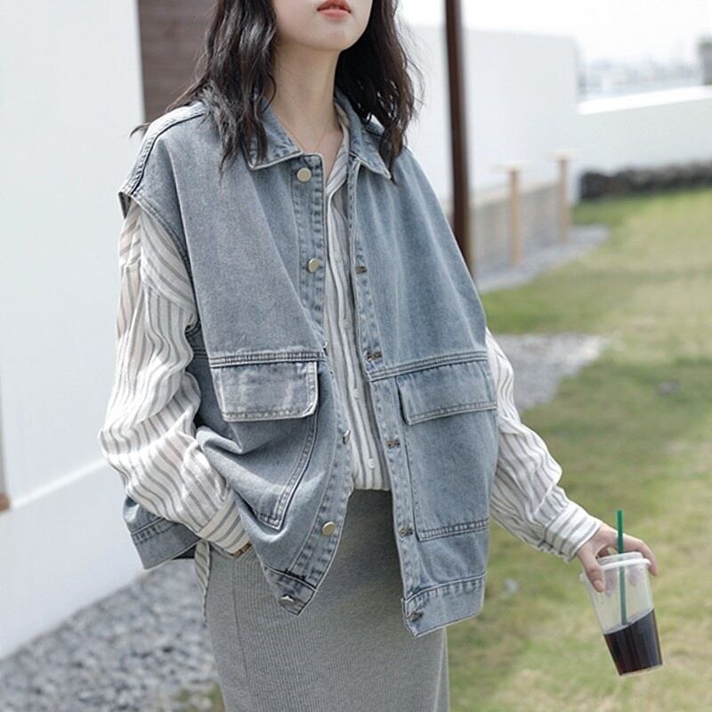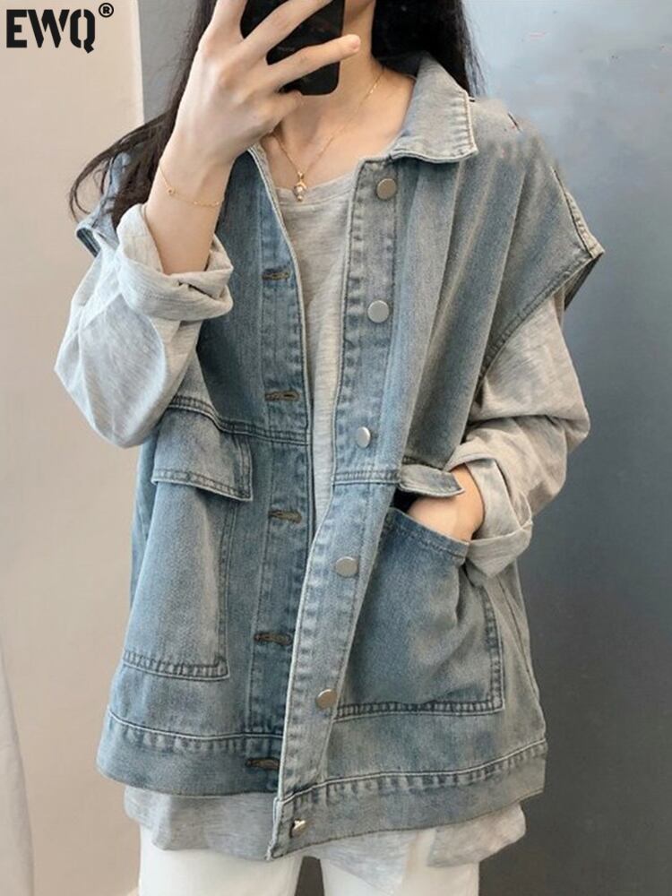 [EWQ] ビッグサイズ デニム ベスト ストリート シングルブレスト ノースリーブ ジャケット 秋トレンド ポケット チョッキ 16O69 オータム 秋物