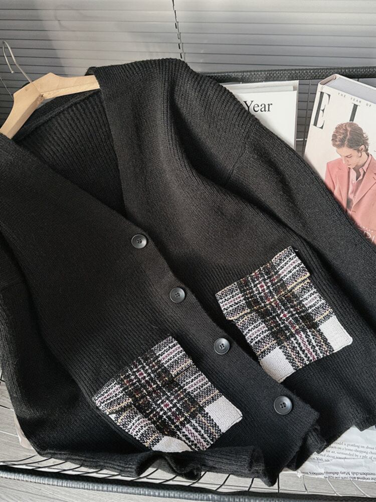 [EWQ] チェック柄カラフルポケットスプライシングカーディガンコート長袖セータージャケット秋冬 16U5096 ロング オータム 秋物 ウィンター 冬物