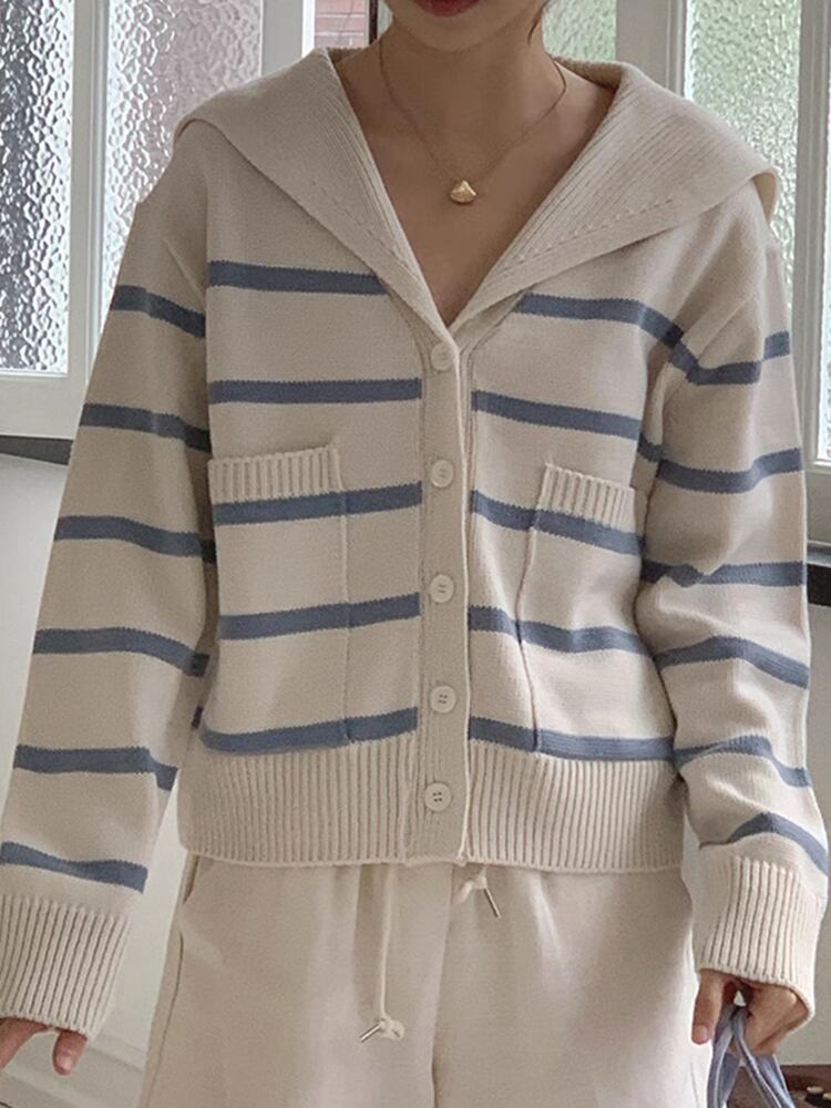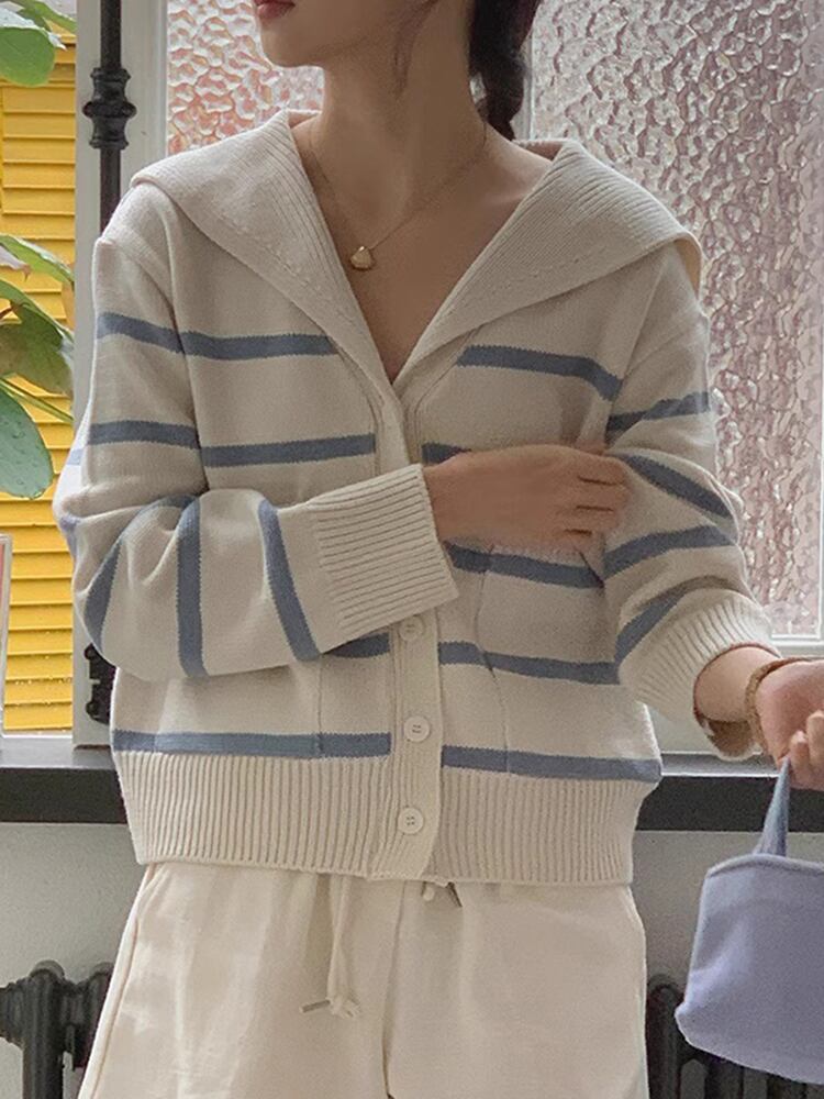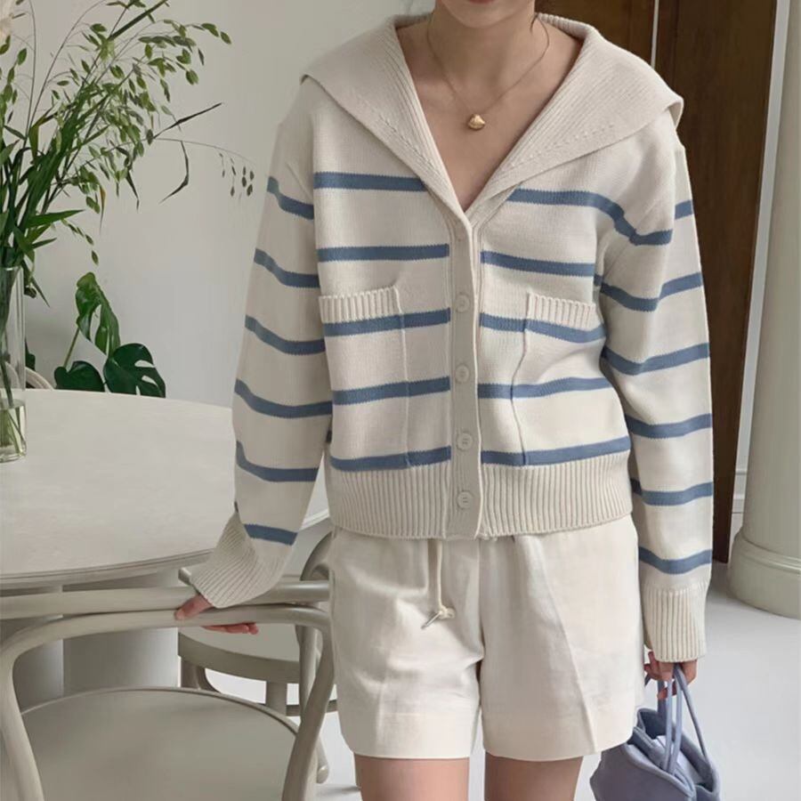 [EWQ] セーラー襟青白ストライプカーディガンコート長袖ダブルポケットセータージャケット秋冬 U4686 ロング ホワイト ブルー オータム 秋物 ウィンター 冬物