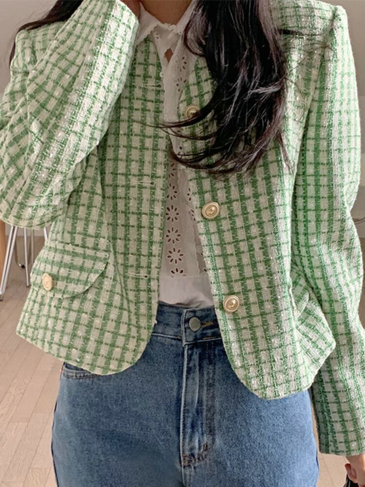 [EWQ] 甘い V ネックチェック柄ツイードジャケット長袖シングルブレストルーズジャケットコート秋冬 16U4154 ロング 大人ガーリー スウィート キュート カジュアル オータム 秋物 ウィンター 冬物 Vネック