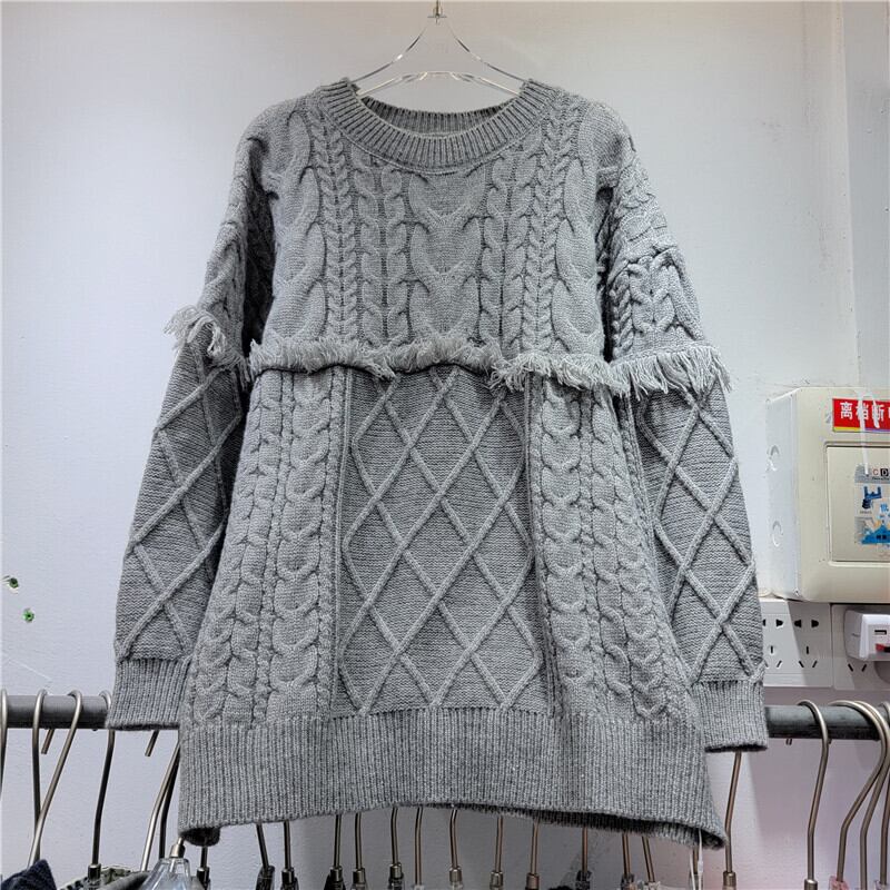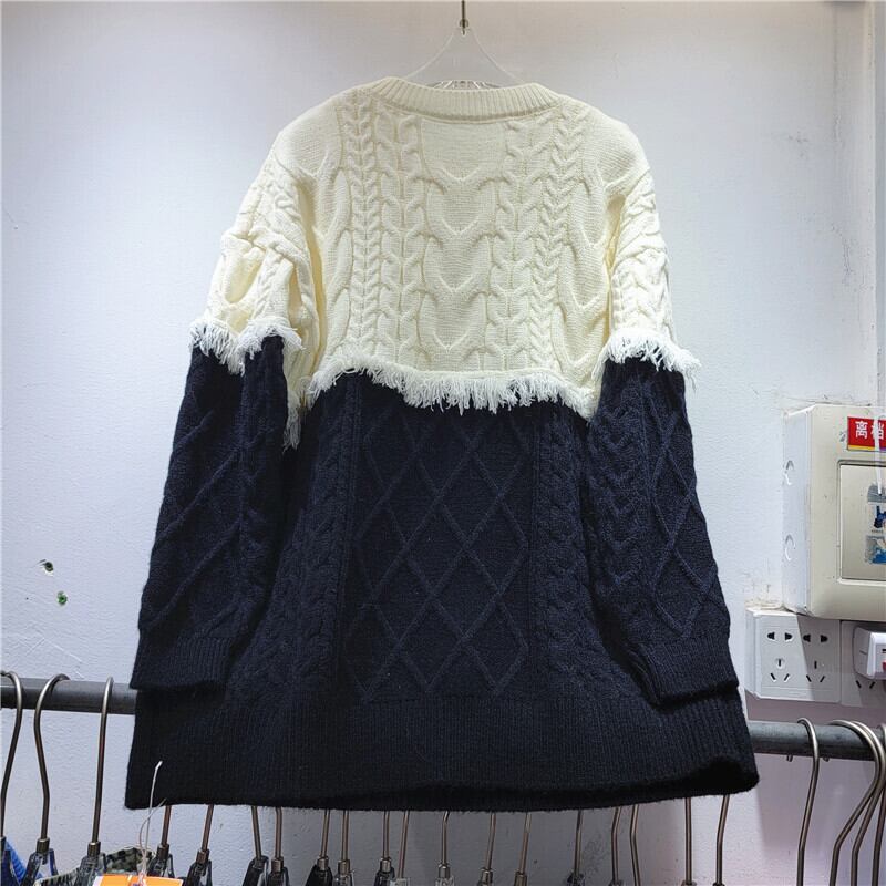 [EWQ] ブラック ホワイト コントラスト テル セーター レディース 長袖 ルーズ プルオーバー ニット トップ 秋冬 16U4643 ロング オータム 秋物 ウィンター 冬物