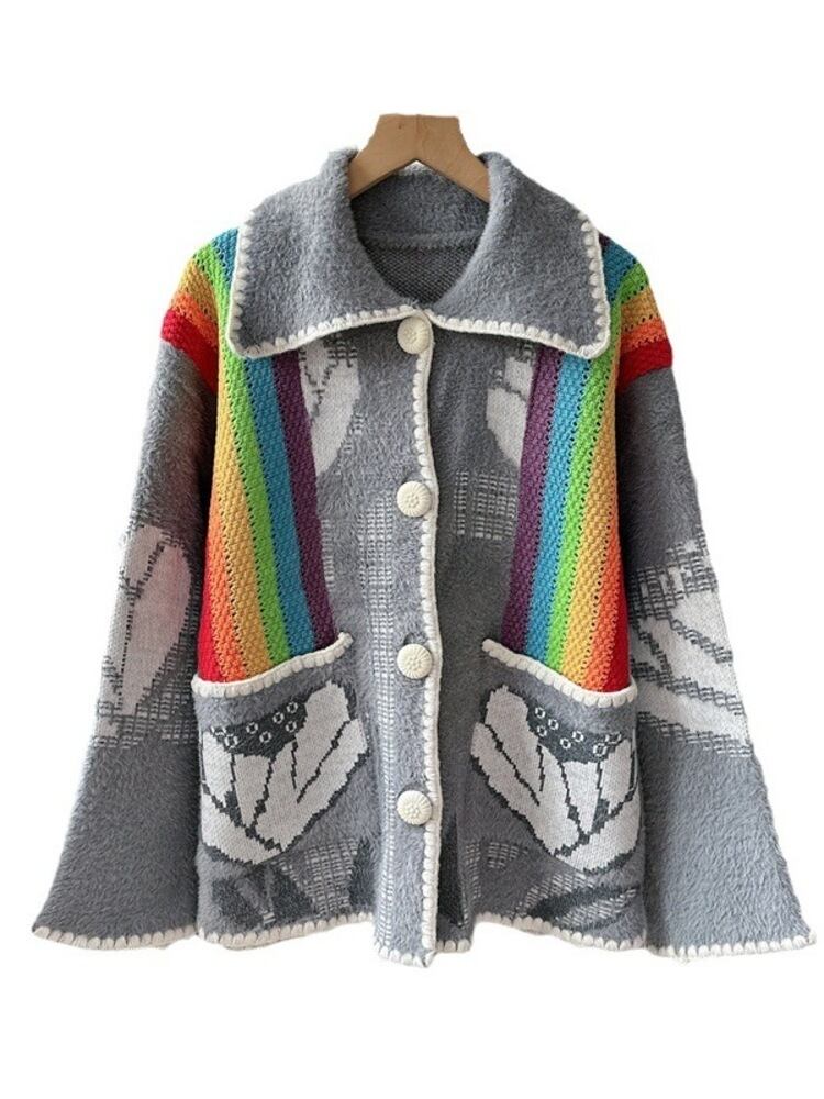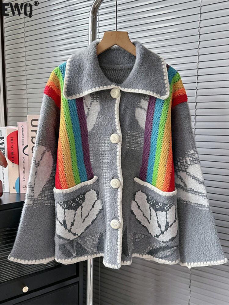 [EWQ] カラフルストライプパッチワークニットセーターコート秋冬トレンドポケットカーディガンジャケット服 16U5109 オータム 秋物 ウィンター 冬物