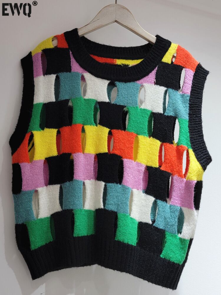 [EWQ] レインボーチェック中空アウトセーターベストカラフル O ネックプルオーバータンクトップ秋冬 レッド オータム 秋物 ウィンター 冬物 Oネック