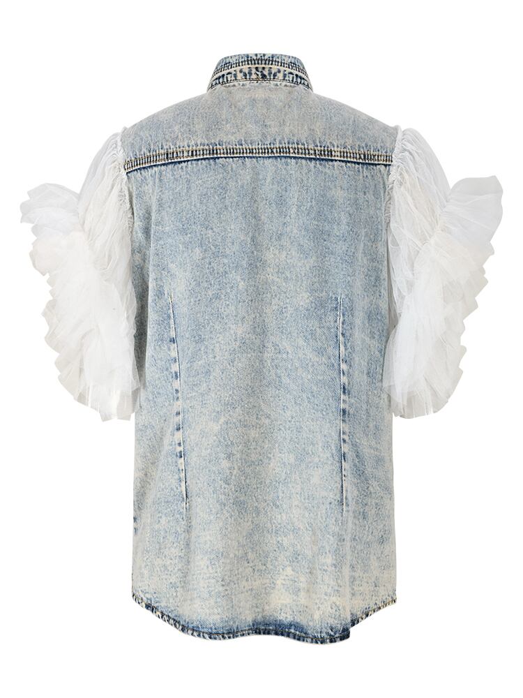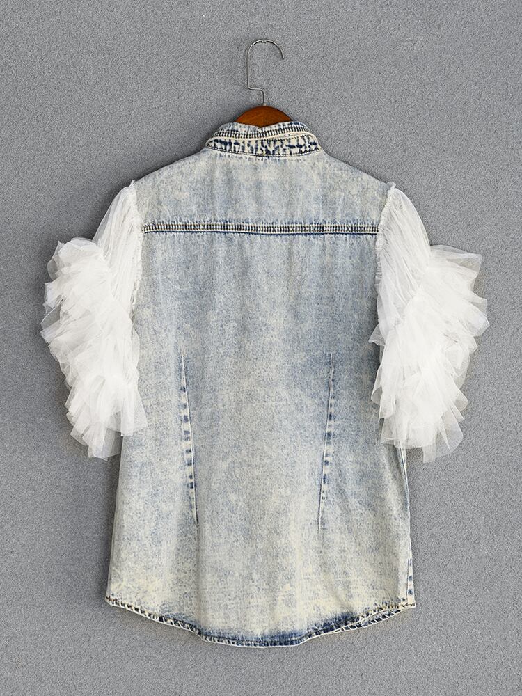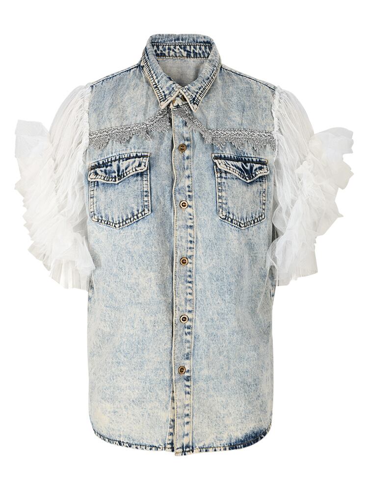 [EWQ] メッシュパッチワークストリートデニムベストビーズスプライスシングルブレストノースリーブジャケット秋 6U135 オータム 秋物