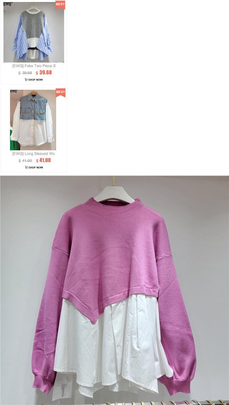 [EWQ] パッチワーク ピンク セーター 甘い長袖フェイク ツーピース スプライシング ルーズ プルオーバー ニット秋冬 6U4463 ロング 大人ガーリー スウィート キュート カジュアル オータム 秋物 ウィンター 冬物