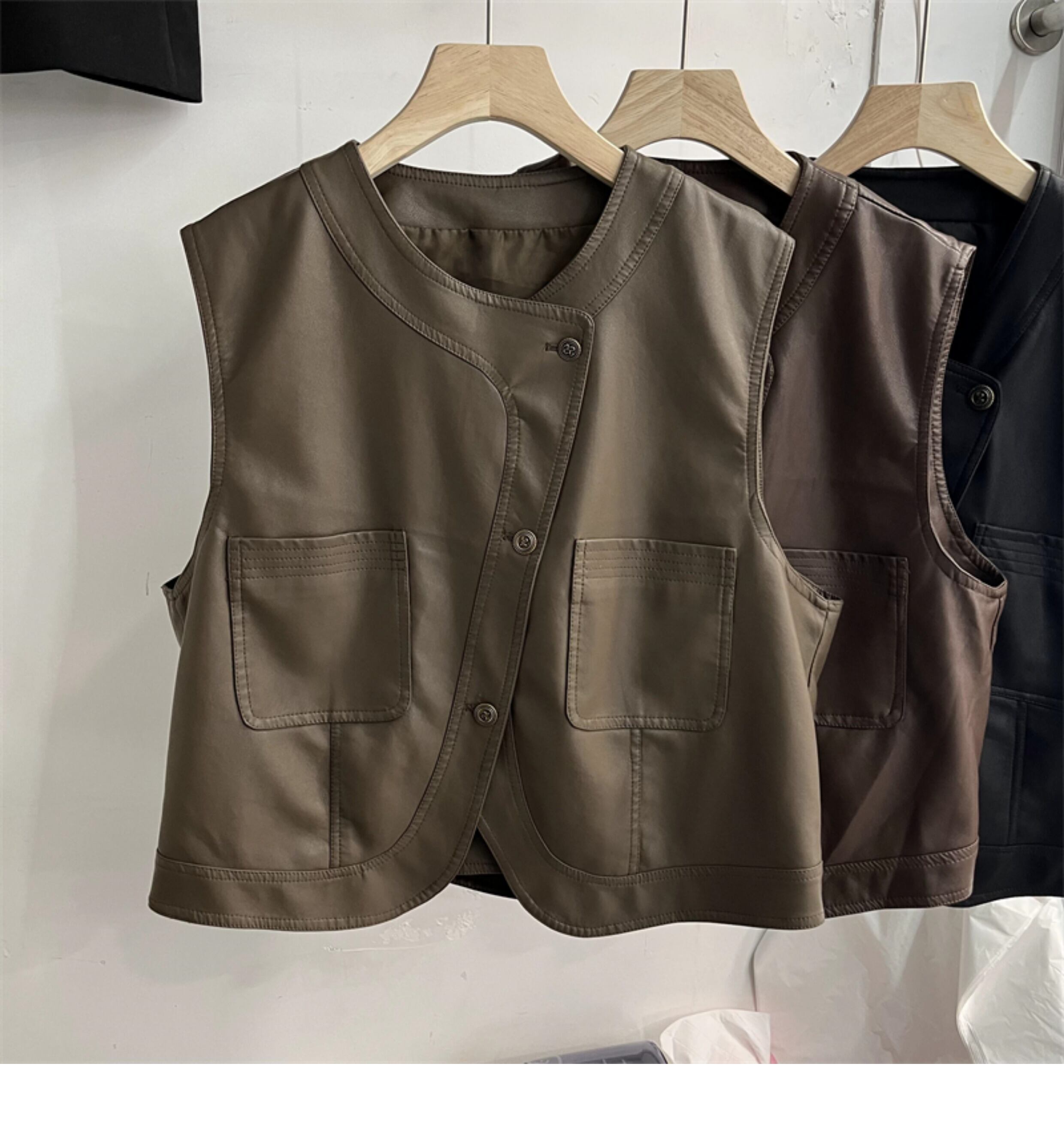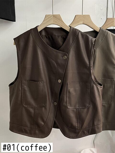 [EWQ] PU レザーベストルーズ不規則パッチワークノースリーブジャケット秋冬チョッキ 16U4833 オータム 秋物 ウィンター 冬物