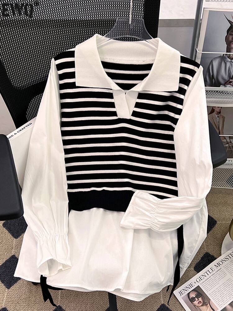 [EWQ] ストライプフェイクツーピースシャツニットセータースプライシング長袖秋冬潮 16U4109 ロング オータム 秋物 ウィンター 冬物