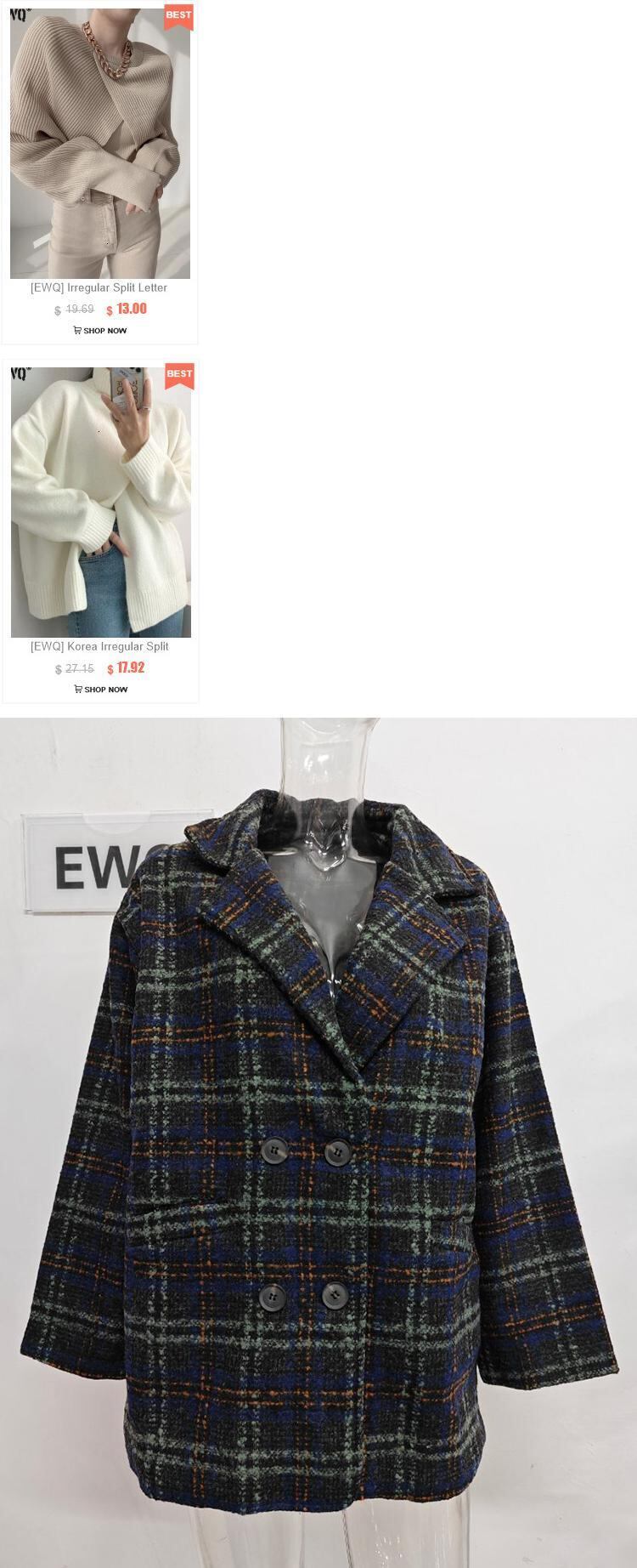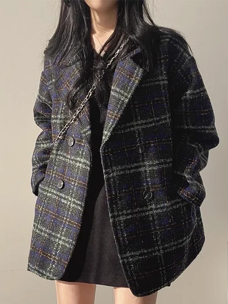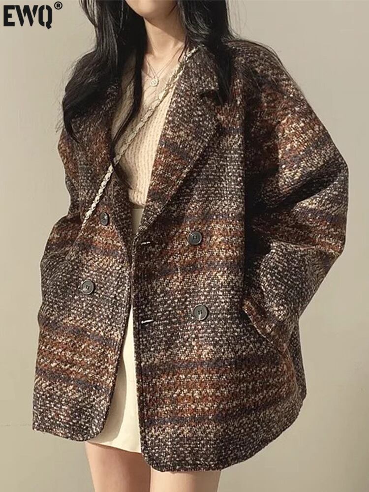 [EWQ] ブラウンチェック柄ツイードウールコートダブルブレスト長袖ルーズウールジャケット秋冬 16U4203 ロング オータム 秋物 ウィンター 冬物