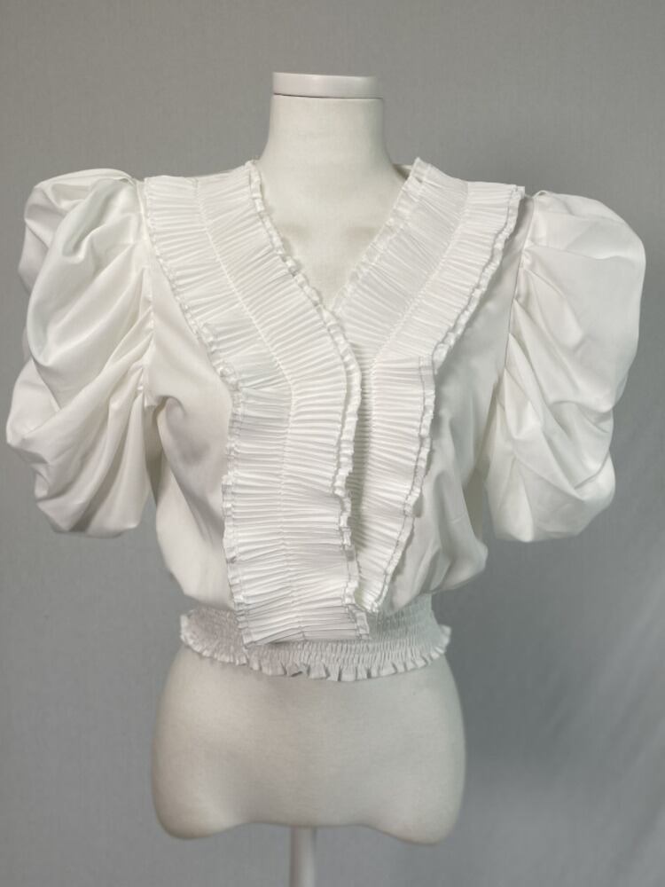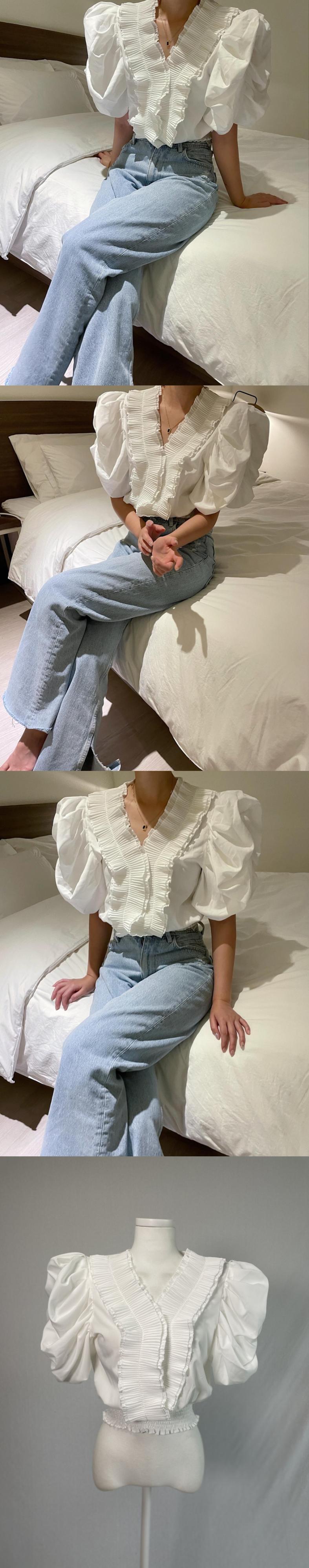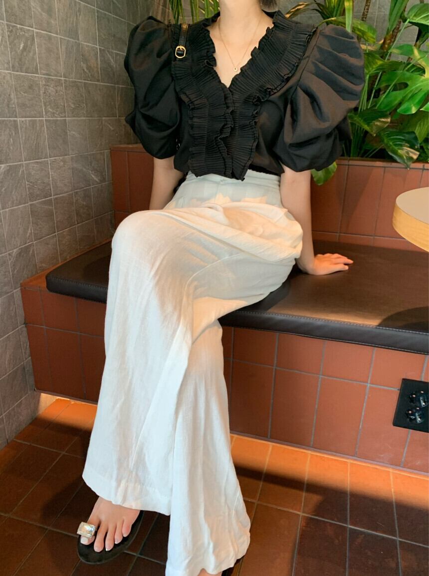 [EWQ] ショート ブラック シャツ トレンド レディース シック Vネック ステッチ フリル ゆったり ブラウス 夏 U5249 サマー 夏物
