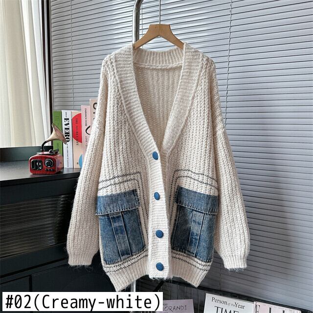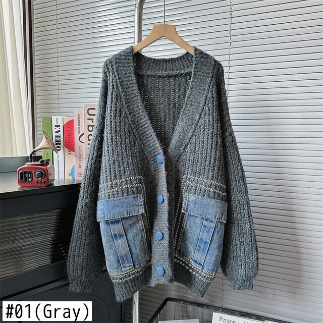 [EWQ] デニムポケットスプライシングカーディガンコートシングルブレストビッグサイズセータージャケット秋冬 16U5117 オータム 秋物 ウィンター 冬物