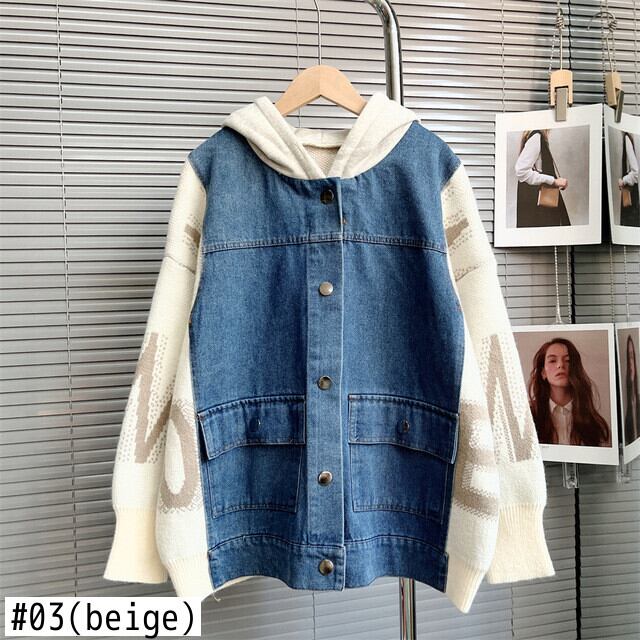 [EWQ] デニムスプライスニットカーディガンコート長袖コントラストルーズシックフード付きセーターコート秋冬 16U5209 ロング オータム 秋物 ウィンター 冬物
