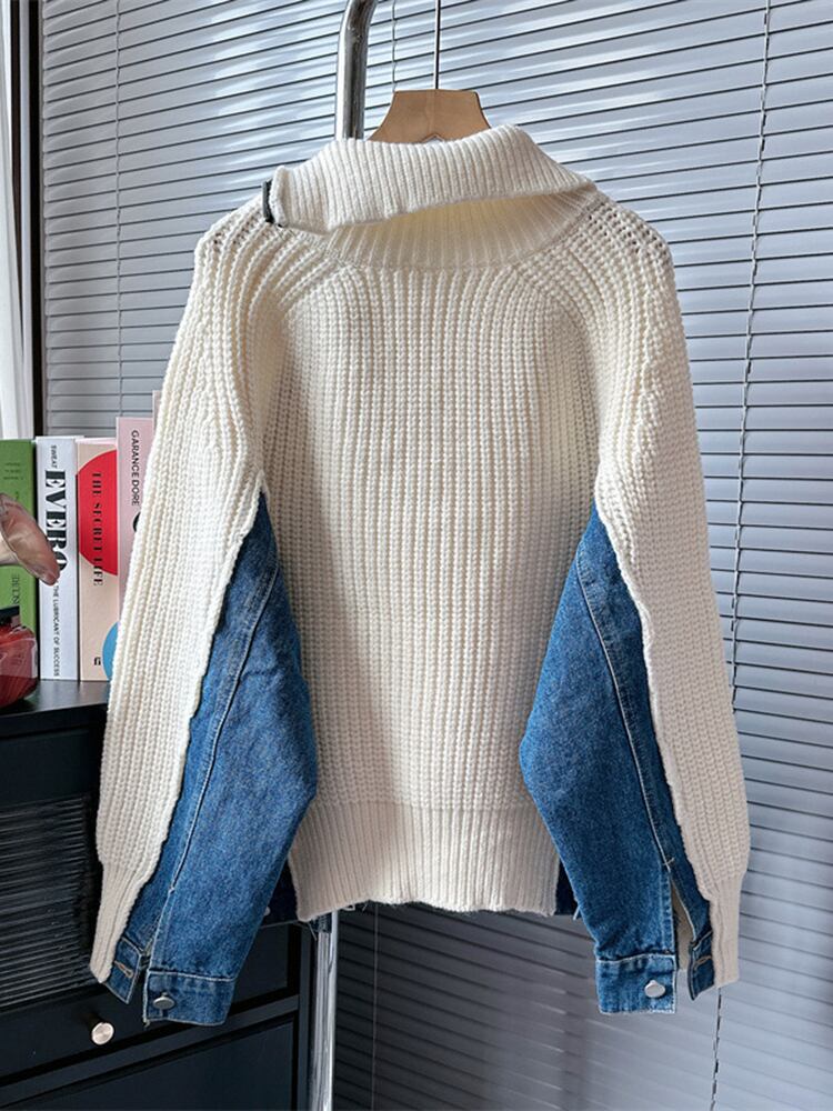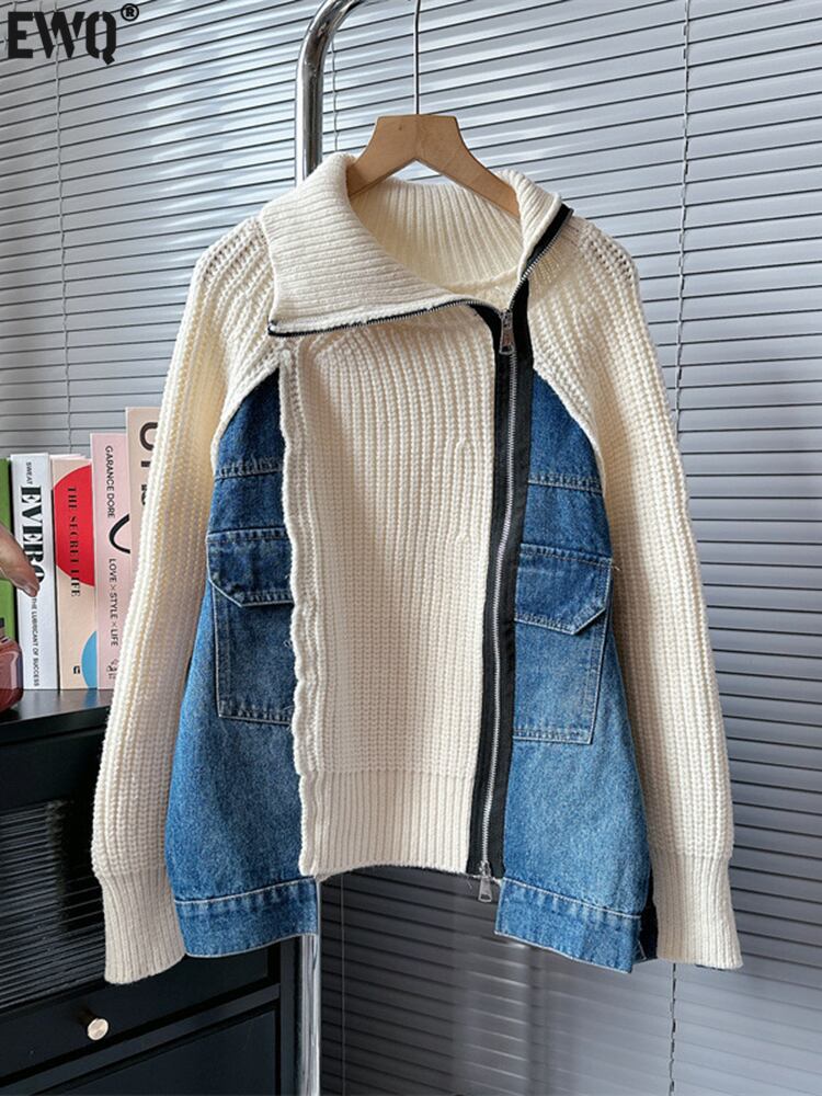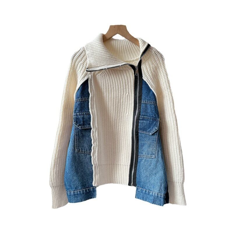 [EWQ] カーディガン コート レディース デニム パッチワーク 変則スタンドカラー ニット セーター ジャケット 秋冬 16U5208 オータム 秋物 ウィンター 冬物