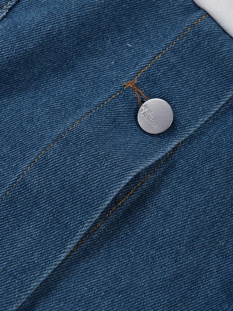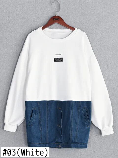 [EWQ] デニムパッチワークコントラストスウェットポケットボタンレターパッチルーズプルオーバートップ秋冬 16U3741 シャツ オータム 秋物 ウィンター 冬物