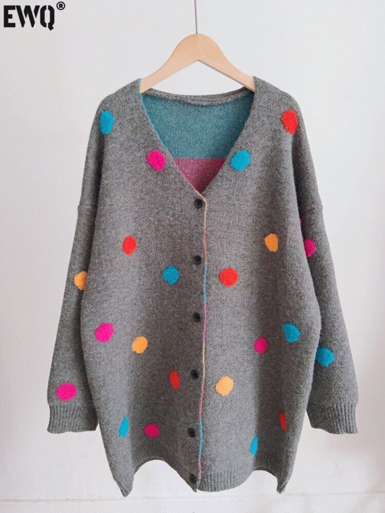 [EWQ] カラフル水玉ニットカーディガンコートシングルブレスト秋冬潮ルーズセータージャケット 16U5166 オータム 秋物 ウィンター 冬物