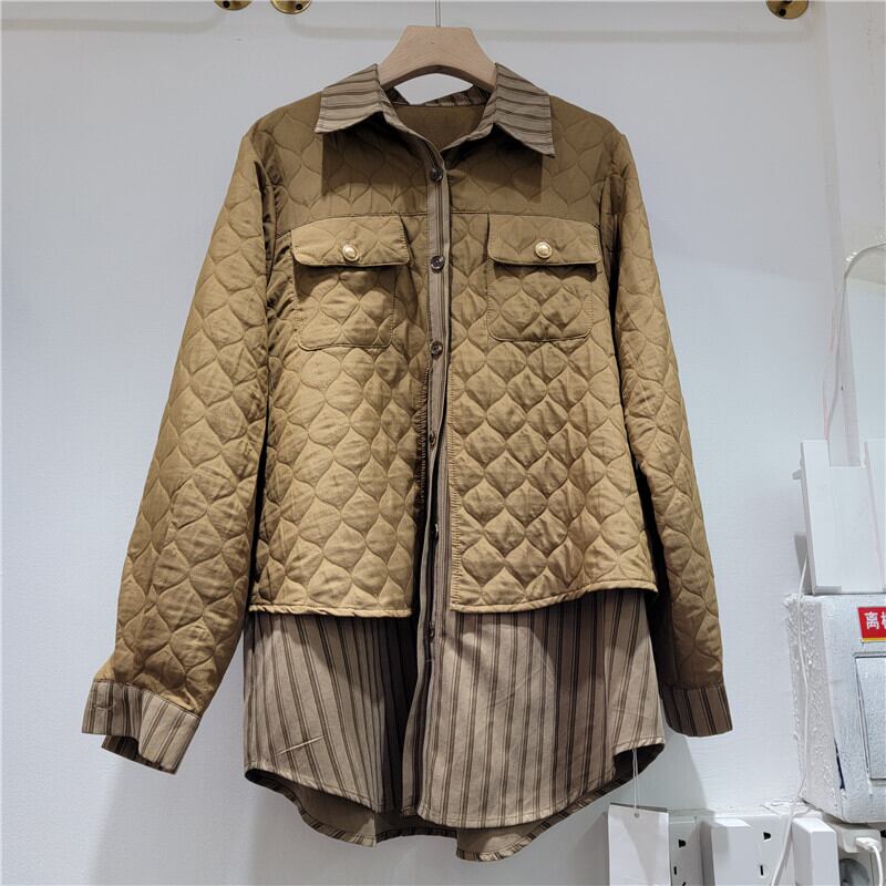 [EWQ] フェイクツーピースパッチワークストライプルーズコットンダウンコート長袖暖かいジャケット秋冬 16U5008 ロング オータム 秋物 ウィンター 冬物