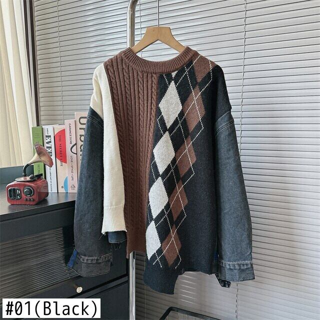 [EWQ] デニムパッチワークセーター秋冬不規則プルオーバーニット美しいトップ Y2k 特大ニット U467 オータム 秋物 ウィンター 冬物
