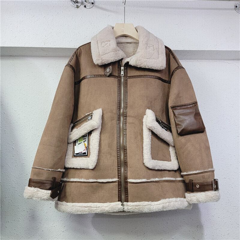 [EWQ] トレンド PU バックル装飾毛皮コート長袖ポケットスプライシング暖かさジッパーウールジャケット秋冬 16U5175 ロング オータム 秋物 ウィンター 冬物