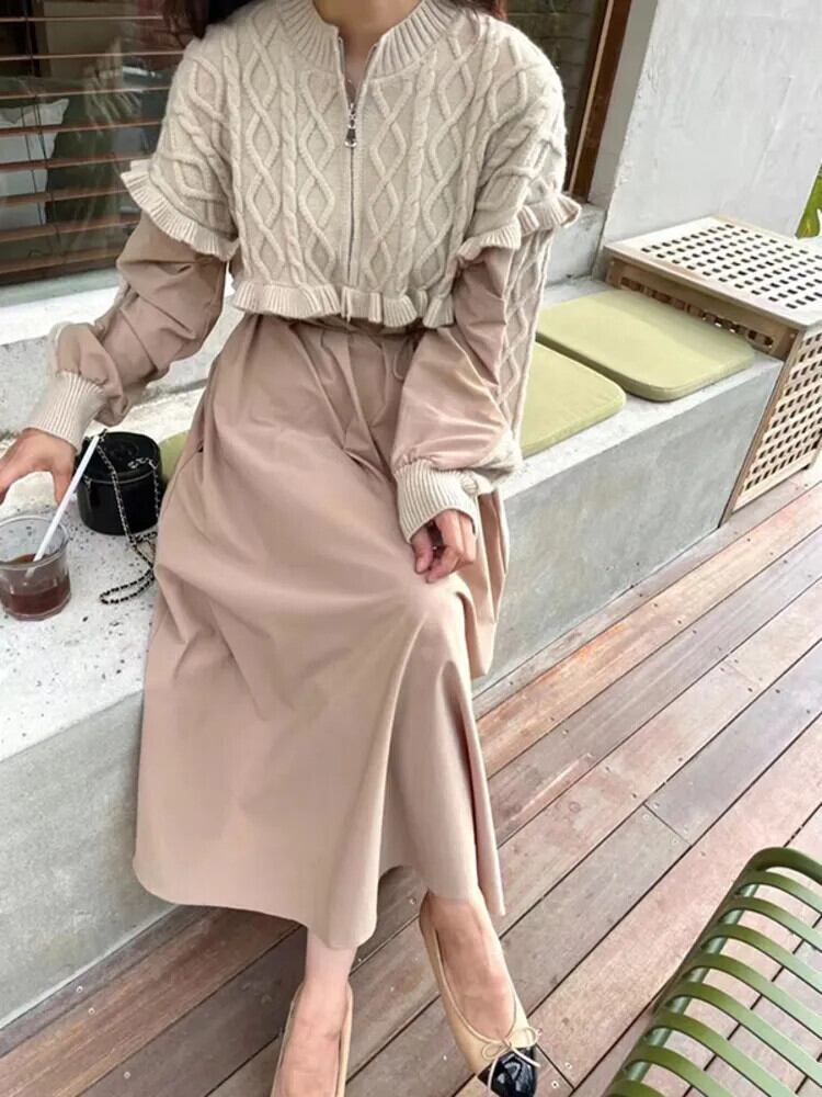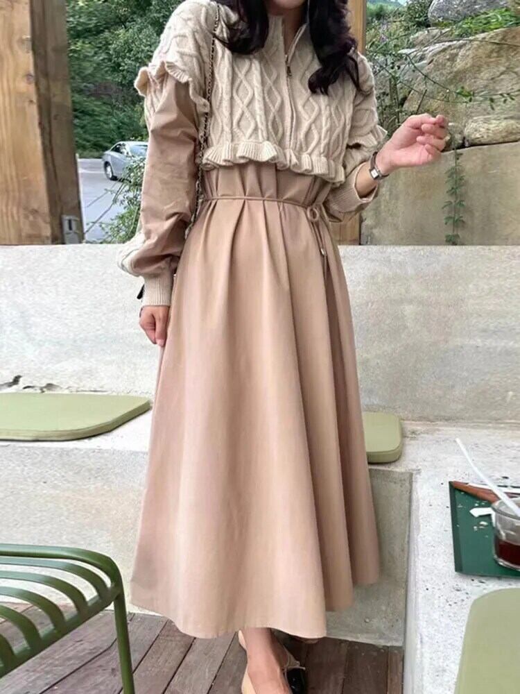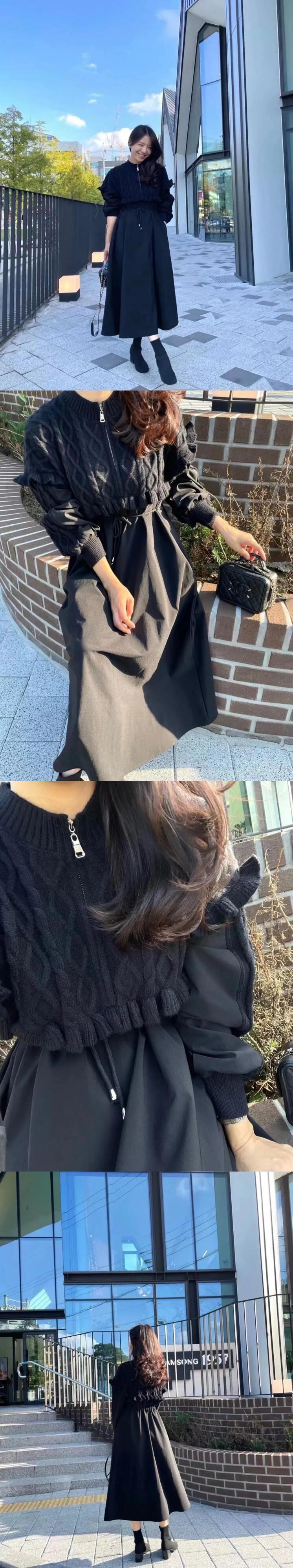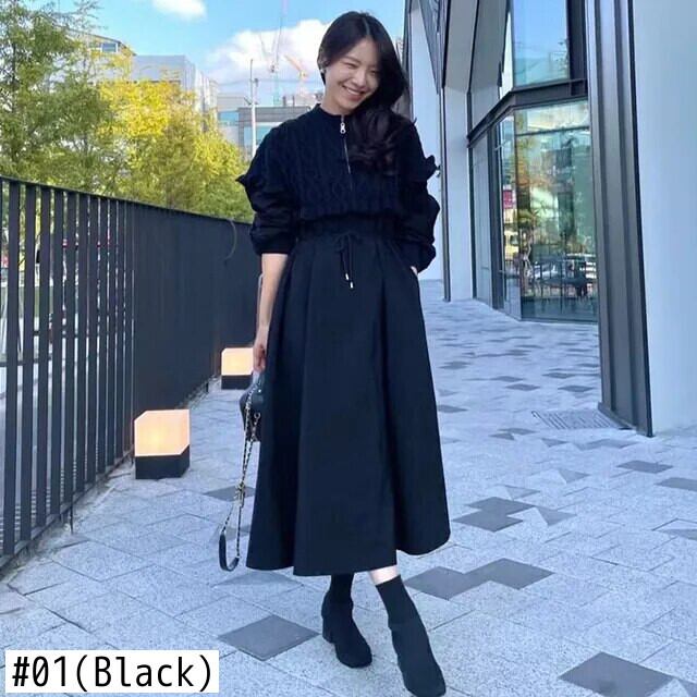 [EWQ] ツイストセーターパッチワークドレス長袖巾着弾性ドレス Vestido 秋冬 16U4442 ロング エラスティック 伸縮 オータム 秋物 ウィンター 冬物