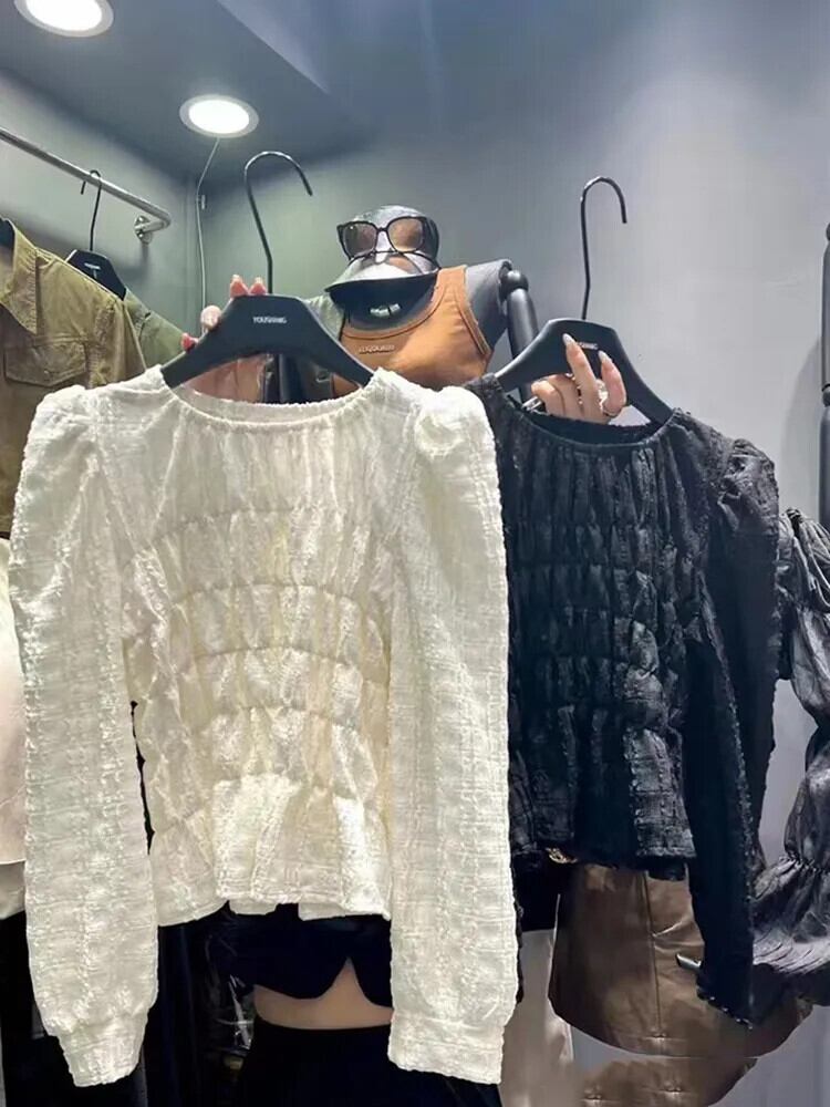 [EWQ] 白ひだシャツ長袖 O ネック弾性ファッションルーズ blusas トップ秋冬新作 16U4601 ロング ホワイト エラスティック 伸縮 オータム 秋物 ウィンター 冬物 Oネック