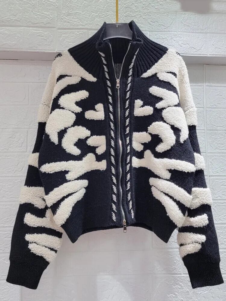 [EWQ] 有能 ブラック ホワイト コントラスト カーディガン コート レディース 長袖 ダブル ジッパー セーター ジャケット 秋冬 16U4807 ロング オータム 秋物 ウィンター 冬物