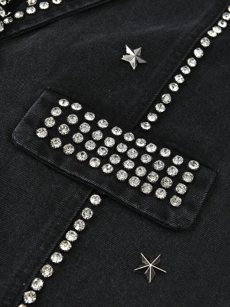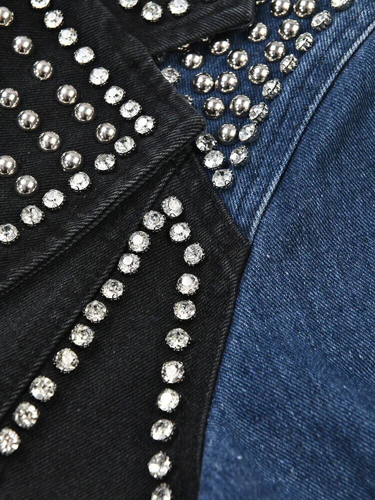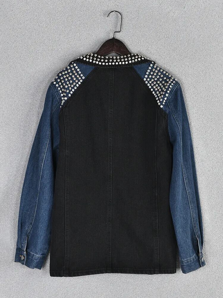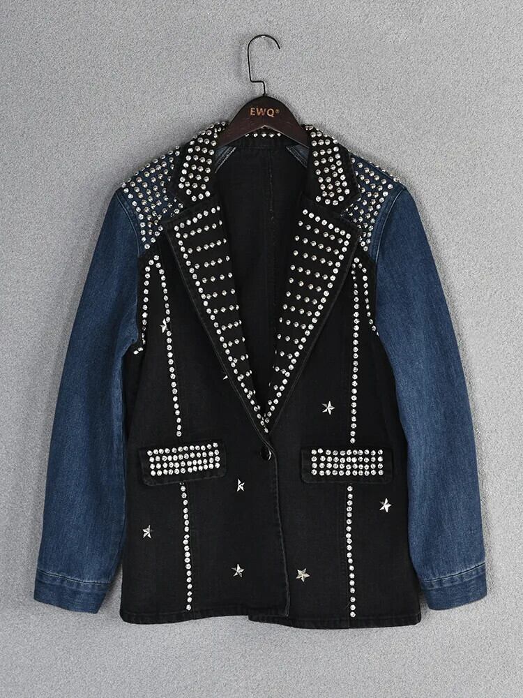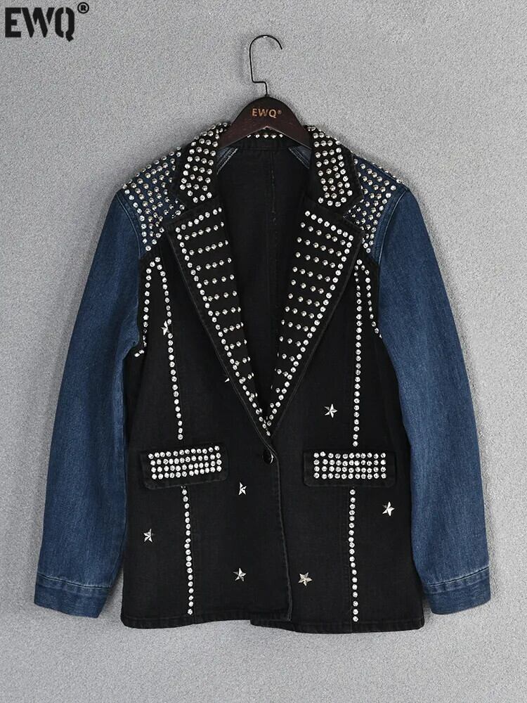 [EWQ] ストリート 5 つ星デニムパッチワークジャケット長袖リベットシングルボタンノッチコート秋冬 16U3429 ロング オータム 秋物 ウィンター 冬物