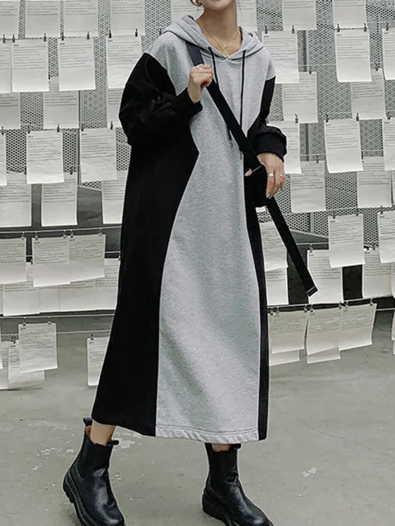 [EWQ] フード付きスウェットドレスパッチワークコントラストビッグサイズ長袖ドレス Vestido 秋冬 16U4959 ロング シャツ オータム 秋物 ウィンター 冬物