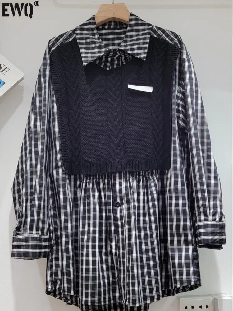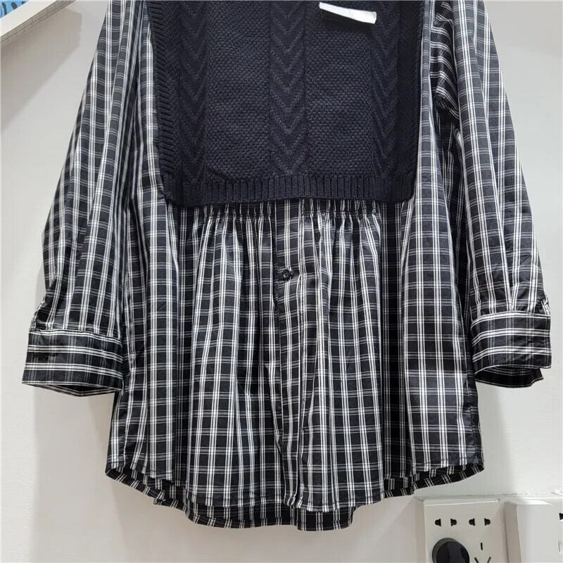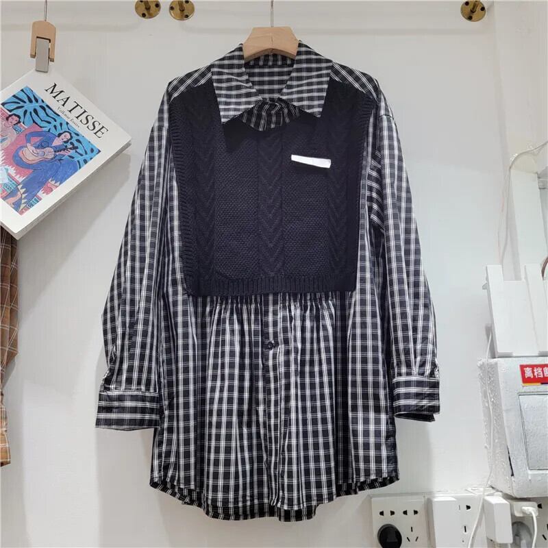 [EWQ] ストライプ ルーズ ニット パッチワーク シャツ レディース 長袖 フェイク ツーピース 秋冬 潮 16U4113 ロング オータム 秋物 ウィンター 冬物