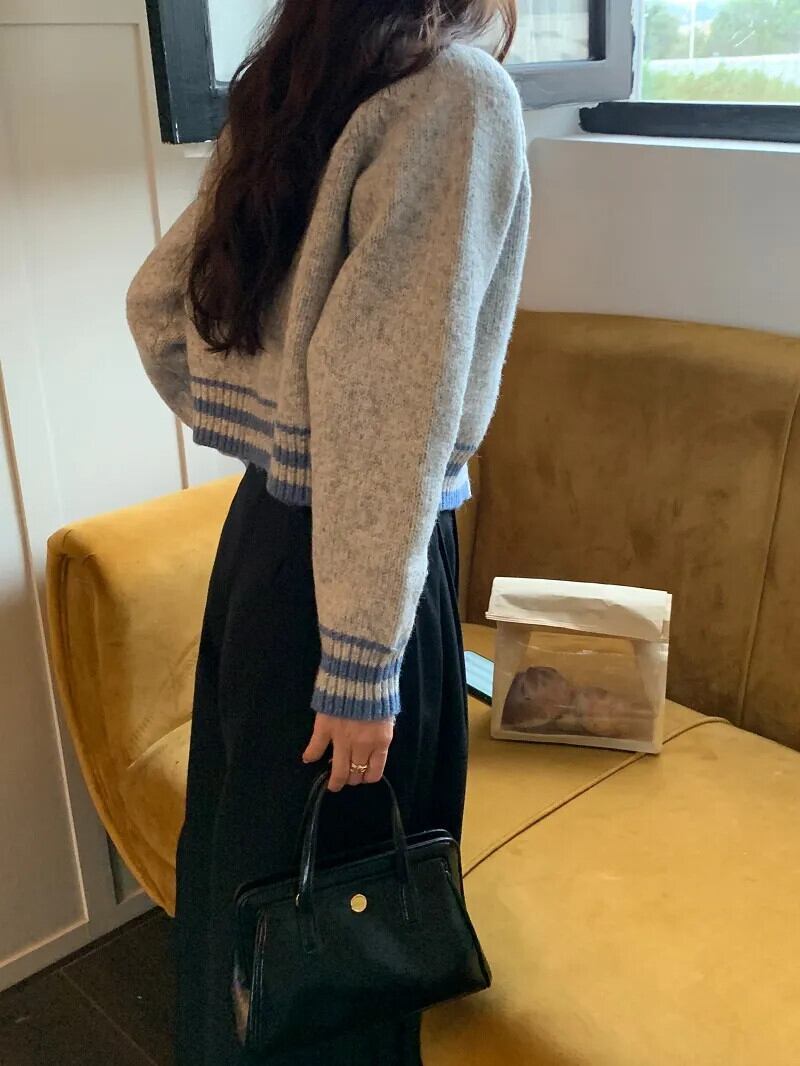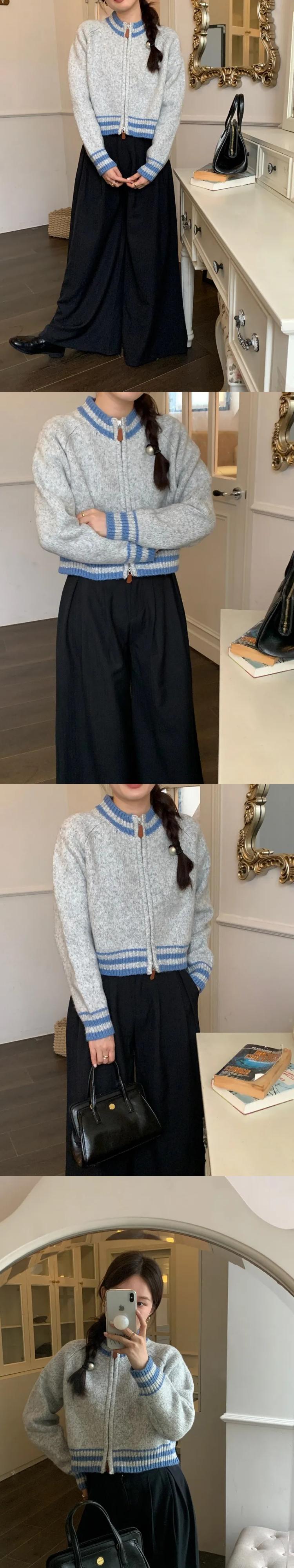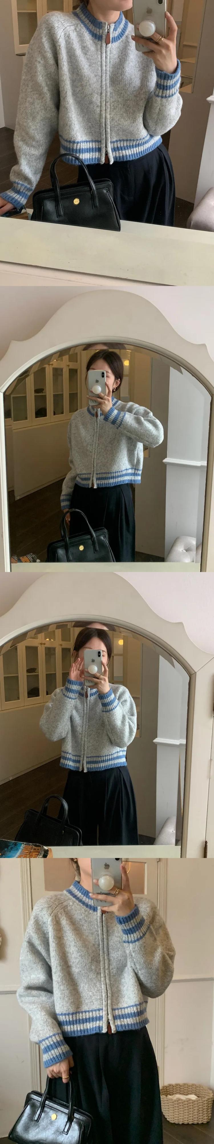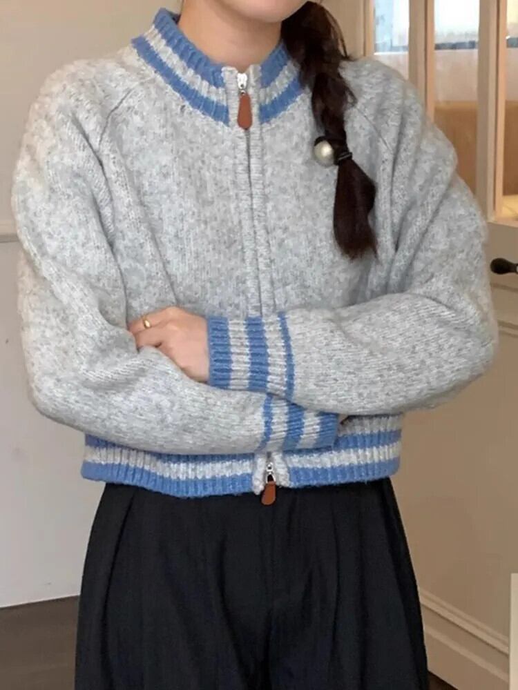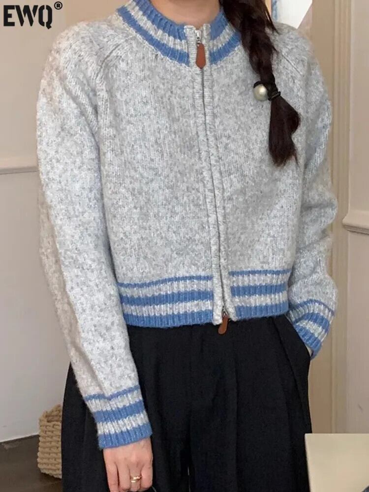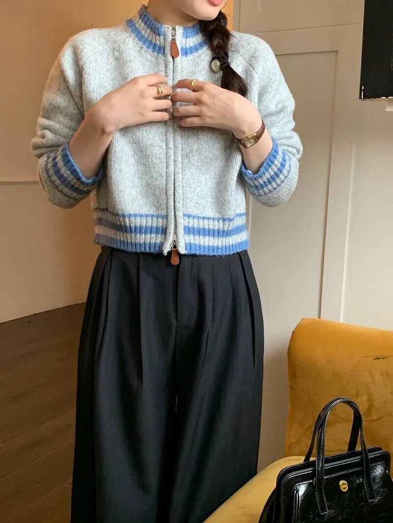 [EWQ] スタンドネック ダブル ジッパー カーディガン コート レディース ストライプ コントラスト ニット セーター ジャケット 秋冬 16U5042 オータム 秋物 ウィンター 冬物