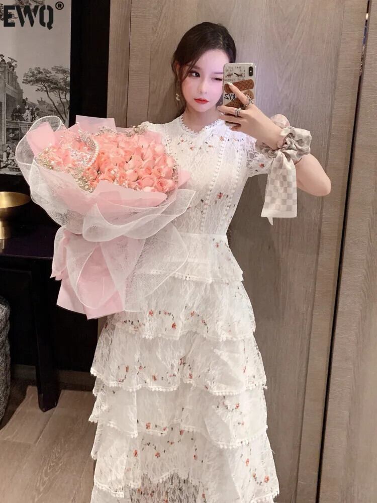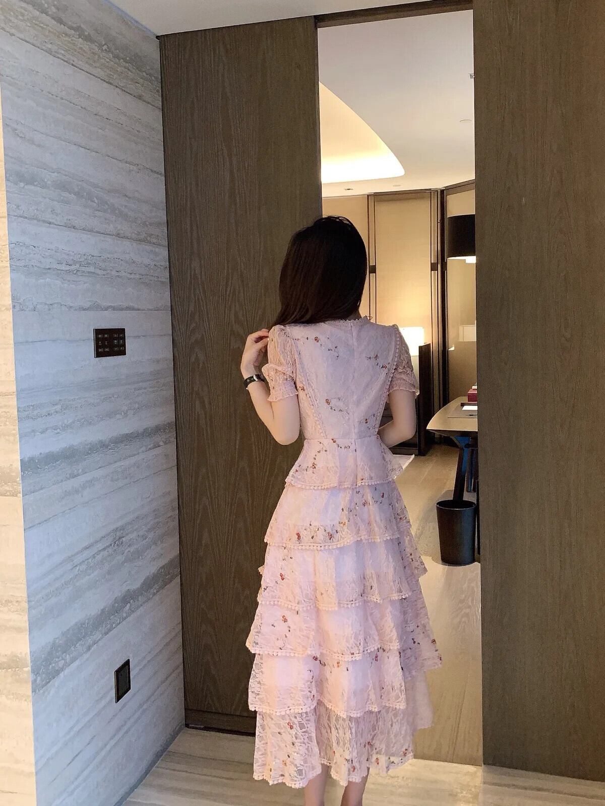 [EWQ]シックフルスリーブピンクレース刺繍マキシドレス春秋ウエストフリルロングパーティードレスU3 スプリング 春物 オータム 秋物