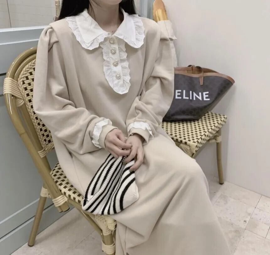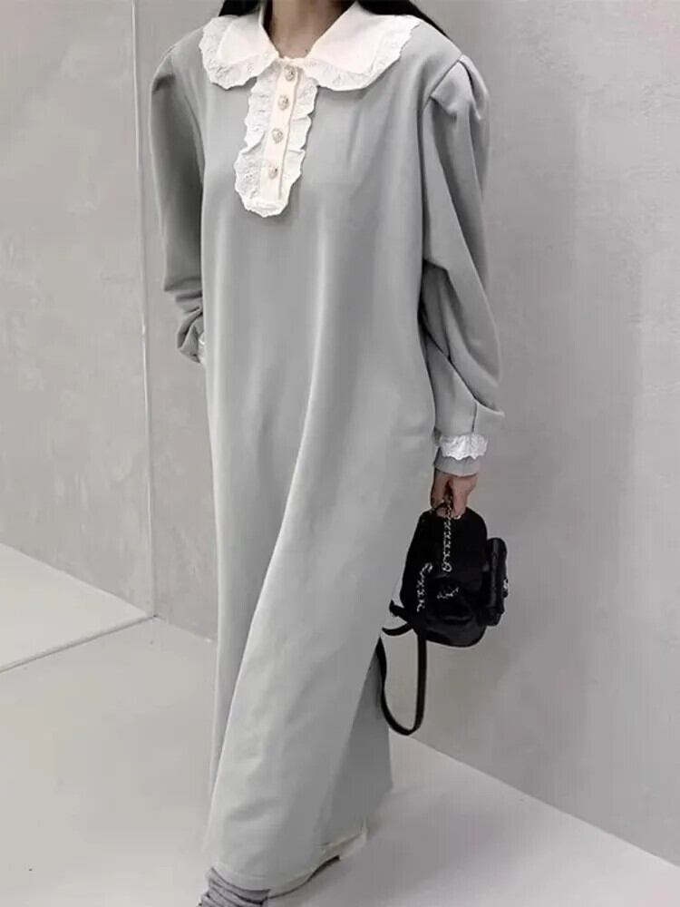 [EWQ] シックボタンパッチワークスウェットシャツぬいぐるみドレス秋冬長袖ルーズ暖かいドレス Vestido 16U4819 ロング オータム 秋物 ウィンター 冬物