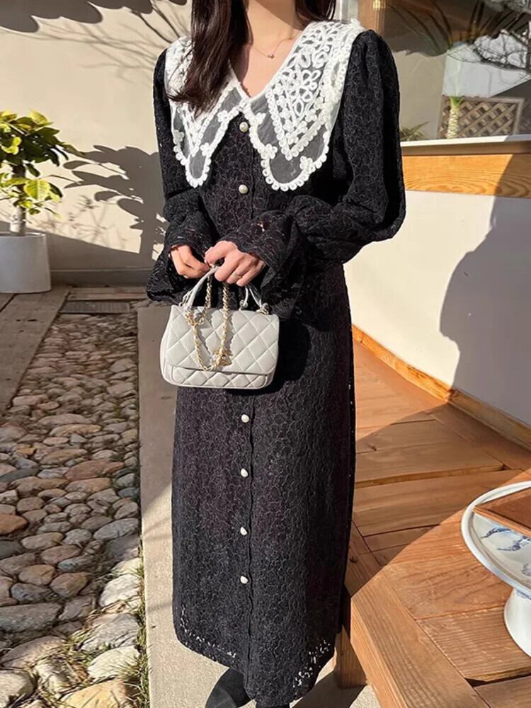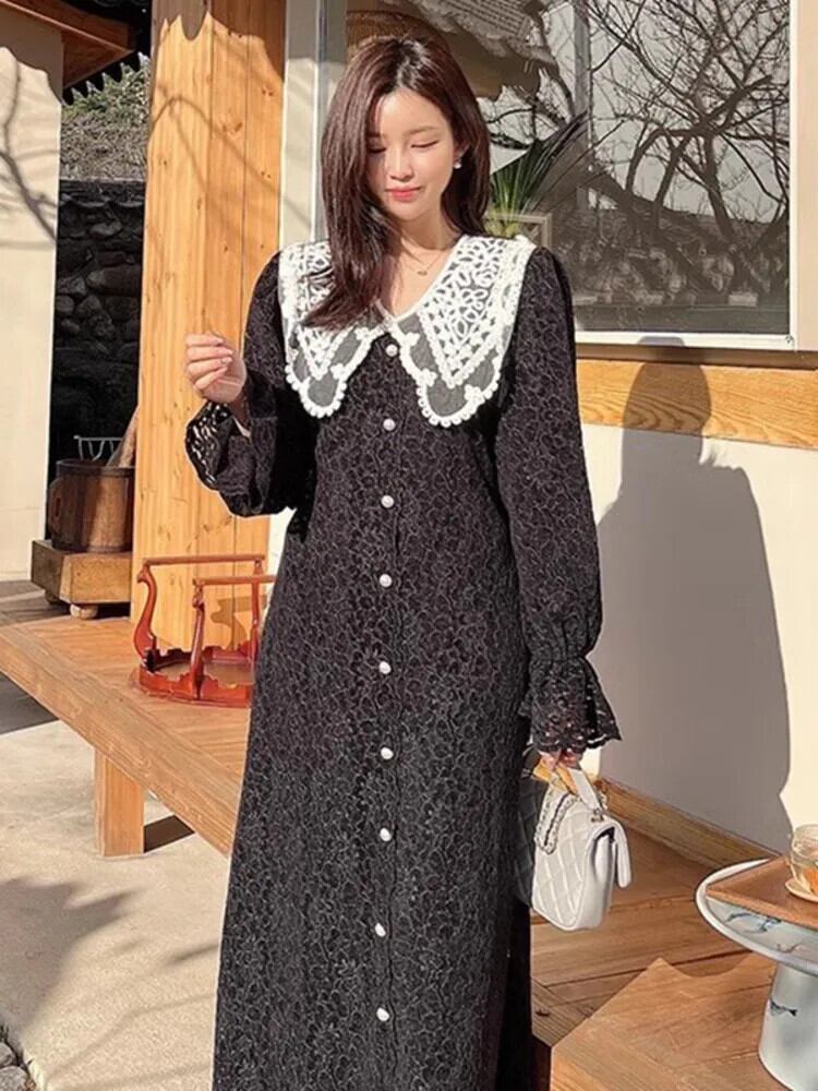 [EWQ] ラペルコントラストパッチワーク気質ドレスフックフラワー長袖パーティードレス秋冬 16U4185 ロング オータム 秋物 ウィンター 冬物 フラワーデザイン