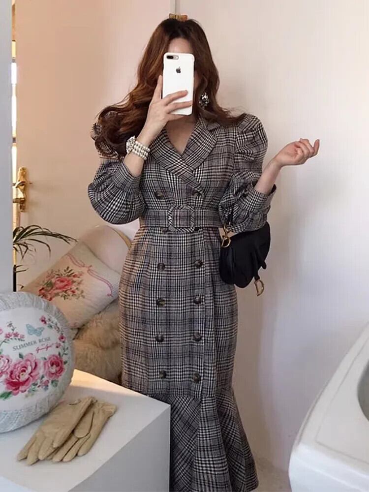 [EWQ] チェック柄ドレス長袖ダブルブレストスリムトランペットドレス Vestido 秋冬 16U4088 ロング オータム 秋物 ウィンター 冬物